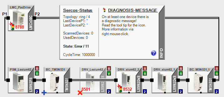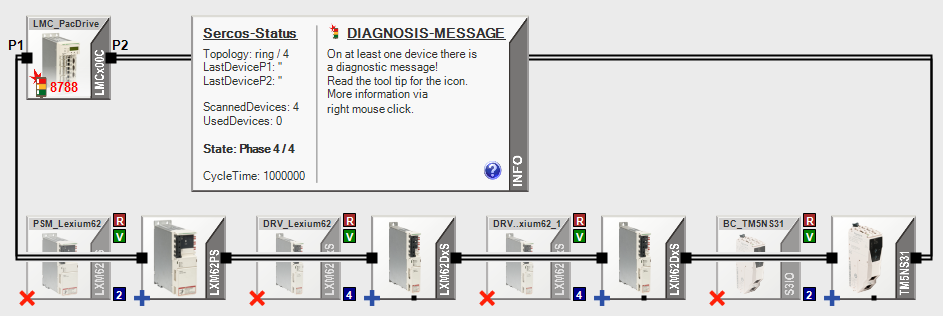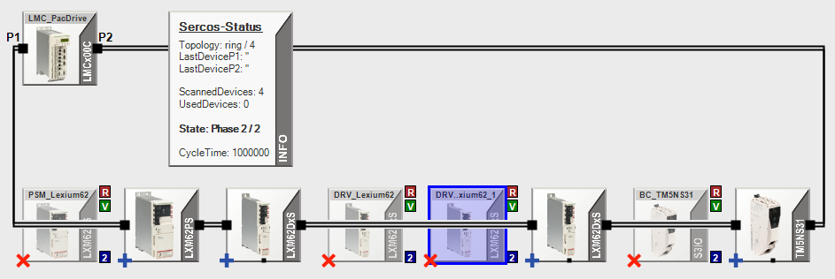 If more than one device with a red “x” is displayed next to each other, this is indicative of a configuration error. This is the case for the devices “DRV..Lexium62” and “DRV..xium62_1”: