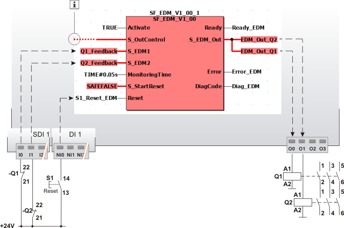 In this example, the safety-related SF_EDM function block controls the two contactors Q1 and Q2 connected to outputs O0 and O1 of the Safety Logic Controller.