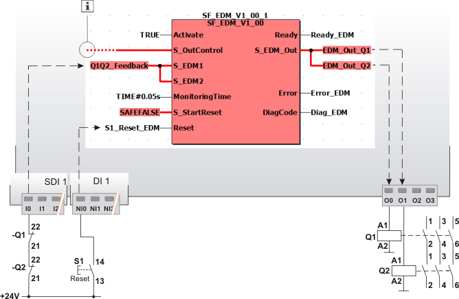 Feedback is provided from each contactor via an N/C contact. The N/C contacts are connected in series and routed to input terminal I0 of the safety-related input device SDI 1. The signal of terminal I0 is assigned to the global I/O variable Q1Q2_Feedback, which in turn is connected to both function block inputs S_EDM1 and S_EDM2.