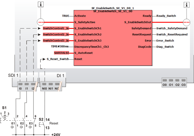 This example illustrates the typical connection of a three-stage enable switch S1 to the safety-related SF_EnableSwitch_SE function block. The three signals from the enable switch are connected to input terminals I0, I1 and I2 of the safety-related input device SDI 1.