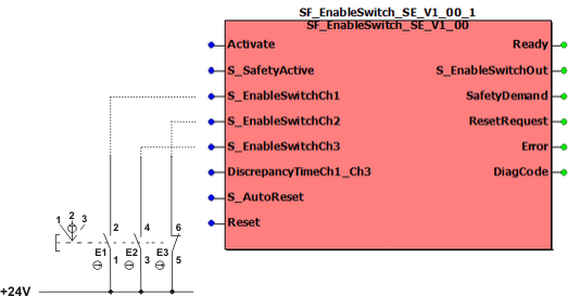 Connect the signals of the enable switch connected to the Safety Logic Controller to the inputs of the safety-related SF_EnableSwitch_SE function block as follows: