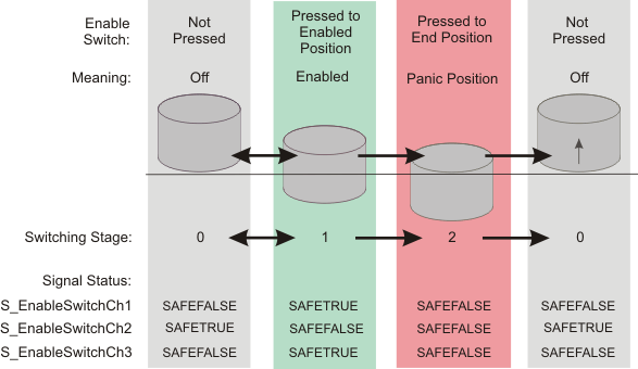 From stage 2 a transition is only possible to stage 0: By releasing the button of the enable switch device, input S_EnableSwitchCh1 and S_EnableSwitchCh3 switch to SAFEFALSE (DiscrepancyTimeCh1_Ch3 is not exceeded) and input S_EnableSwitchCh2 becomes SAFETRUE. S_EnableSwitchOut output remains SAFEFALSE. |