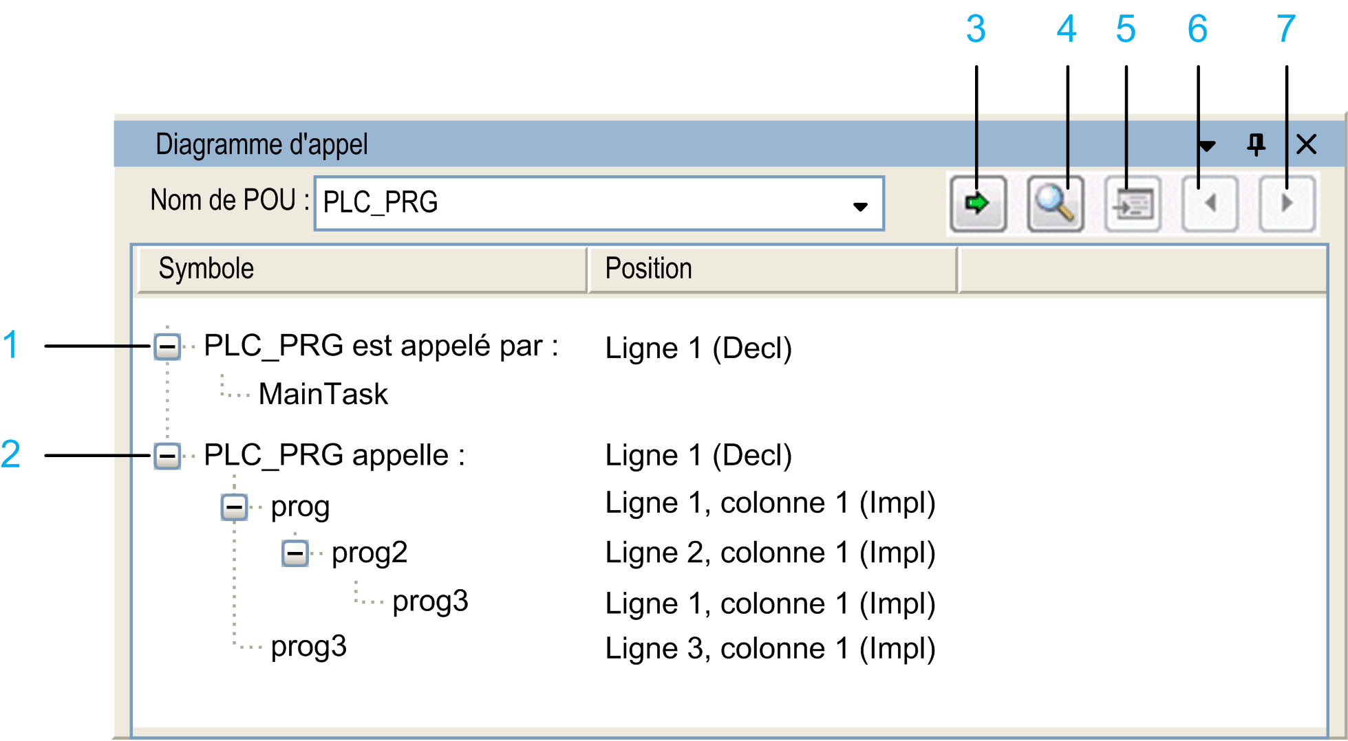 Cliquez sur le bouton ou appuyez sur les touches + du clavier pour atteindre l'occurrence précédente du POU dans la structure d'appels. La position correspondante dans le code source s'ouvre dans l'éditeur concerné. |