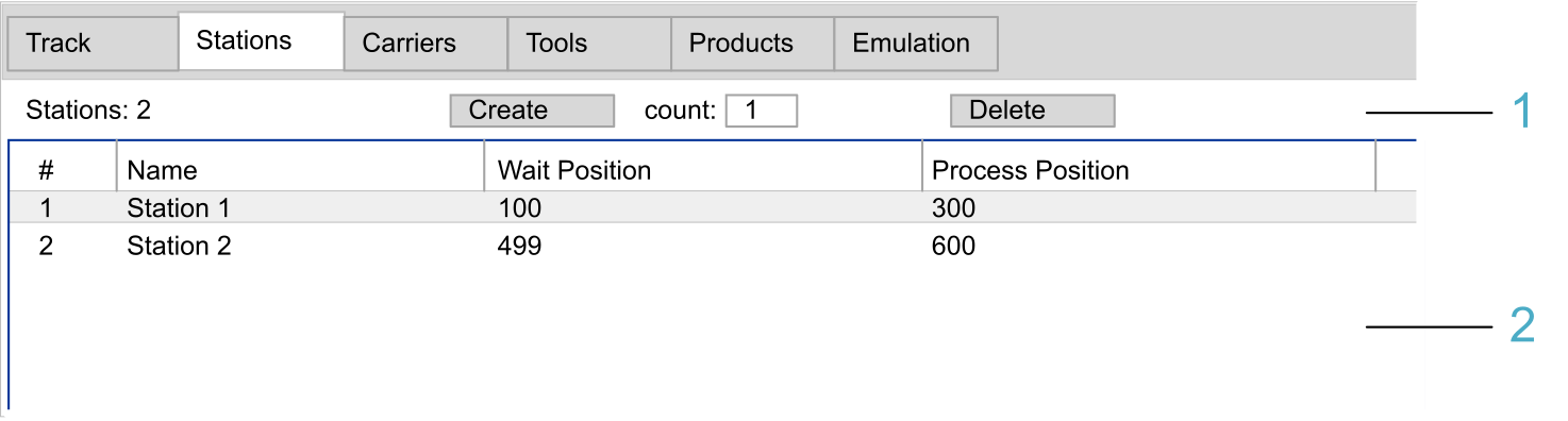 Enter the number of stations to be created in the count field and click the Create button. Result: The stations are displayed in the table view. |