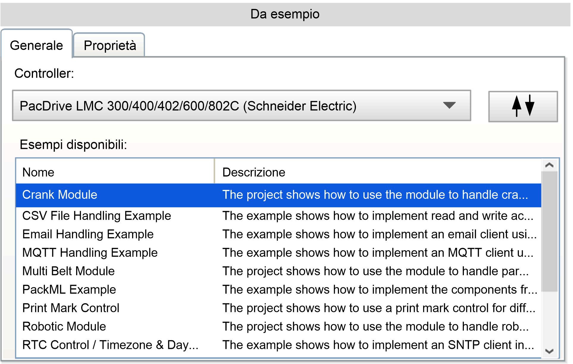 Quando si seleziona , il riquadro a destra mostra la scheda . Poiché EcoStruxure Machine Expert fornisce un'ampia gamma di progetti di esempio, il pulsante consente di filtrare gli esempi per controller o nomi di esempio. Selezionare un controller o un esempio dall'elenco superiore e un esempio corrispondente dall'elenco inferiore, quindi fare clic su per creare un progetto basato su questo esempio.
