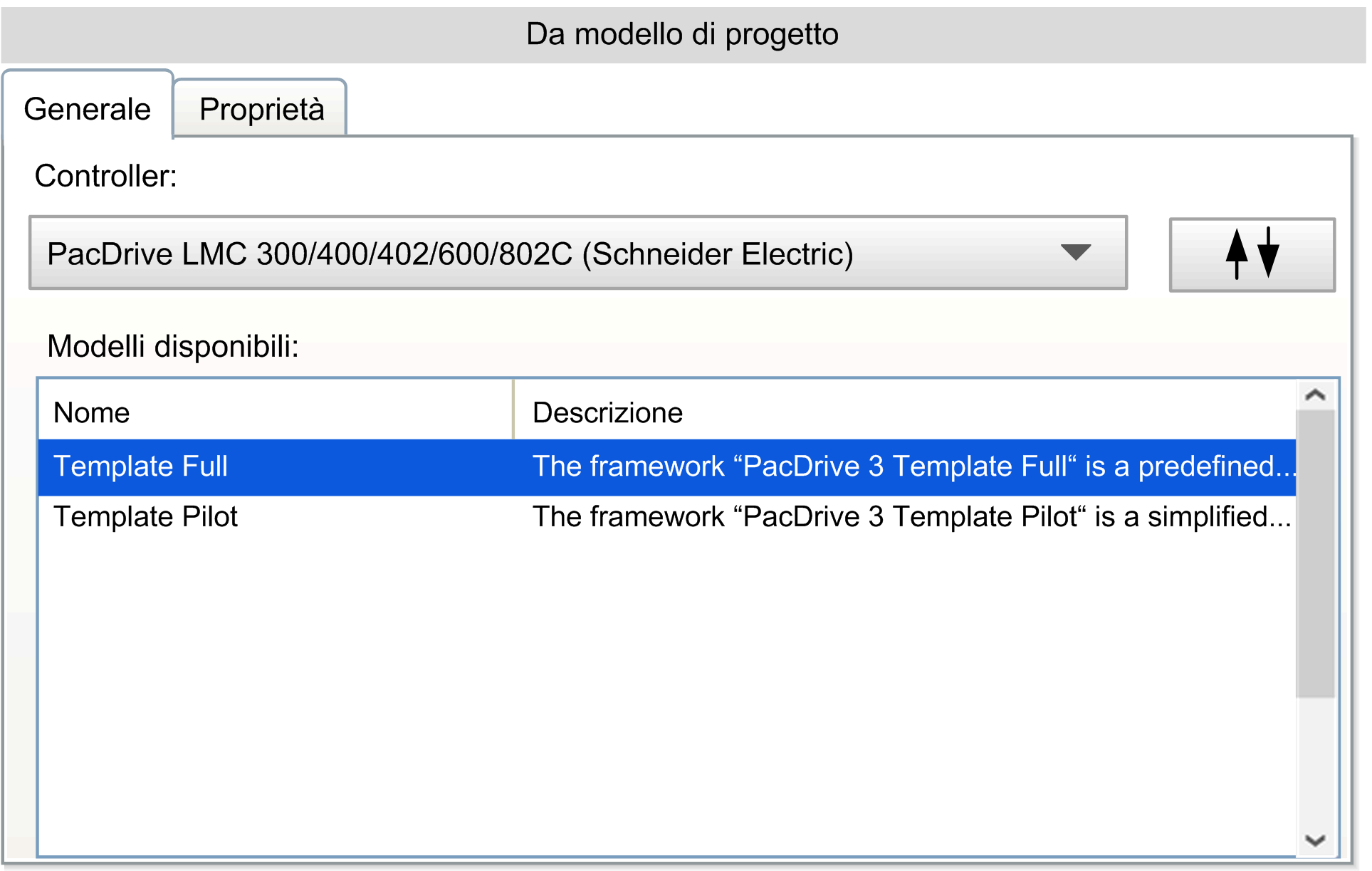 Quando si seleziona , il riquadro a destra mostra la scheda . Poiché EcoStruxure Machine Expert fornisce un'ampia gamma di modelli di progetti, il pulsante consente di filtrare i modelli per controller o tipi di modello. Selezionare un controller o un tipo di modello dall'elenco superiore e un modello corrispondente dall'elenco inferiore, quindi fare clic su per creare un progetto basato su questo modello.
