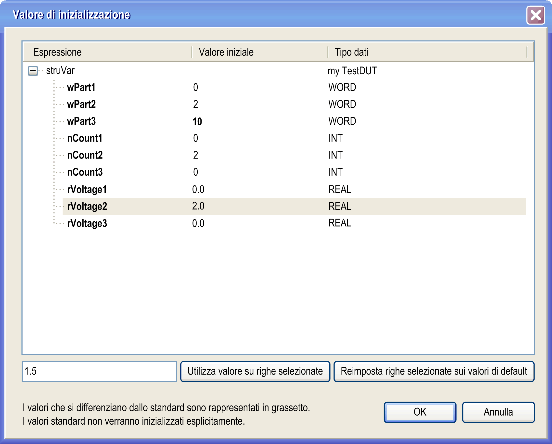 Qui è possibile immettere un valore di inizializzazione esplicito per la variabile. Se si lascia vuoto questo campo, la variabile viene inizializzata con il valore predefinito. Utilizzare il pulsante per ottenere assistenza dalla finestra di dialogo , che può essere utile per l'inizializzazione delle variabili strutturate. La finestra di dialogo elenca i nomi delle variabili (), il correntemente applicato e il . Fondamentalmente, i valori predefiniti vengono visualizzati secondo quanto definito nella dichiarazione del tipo dati. Per modificare un valore, immettere quello nuovo nel campo di modifica sotto la tabella, selezionare le espressioni rispettive e fare clic sul pulsante . I valori di inizializzazione modificati vengono visualizzati in grassetto. È possibile ripristinare i valori di inizializzazione predefiniti tramite il pulsante .
