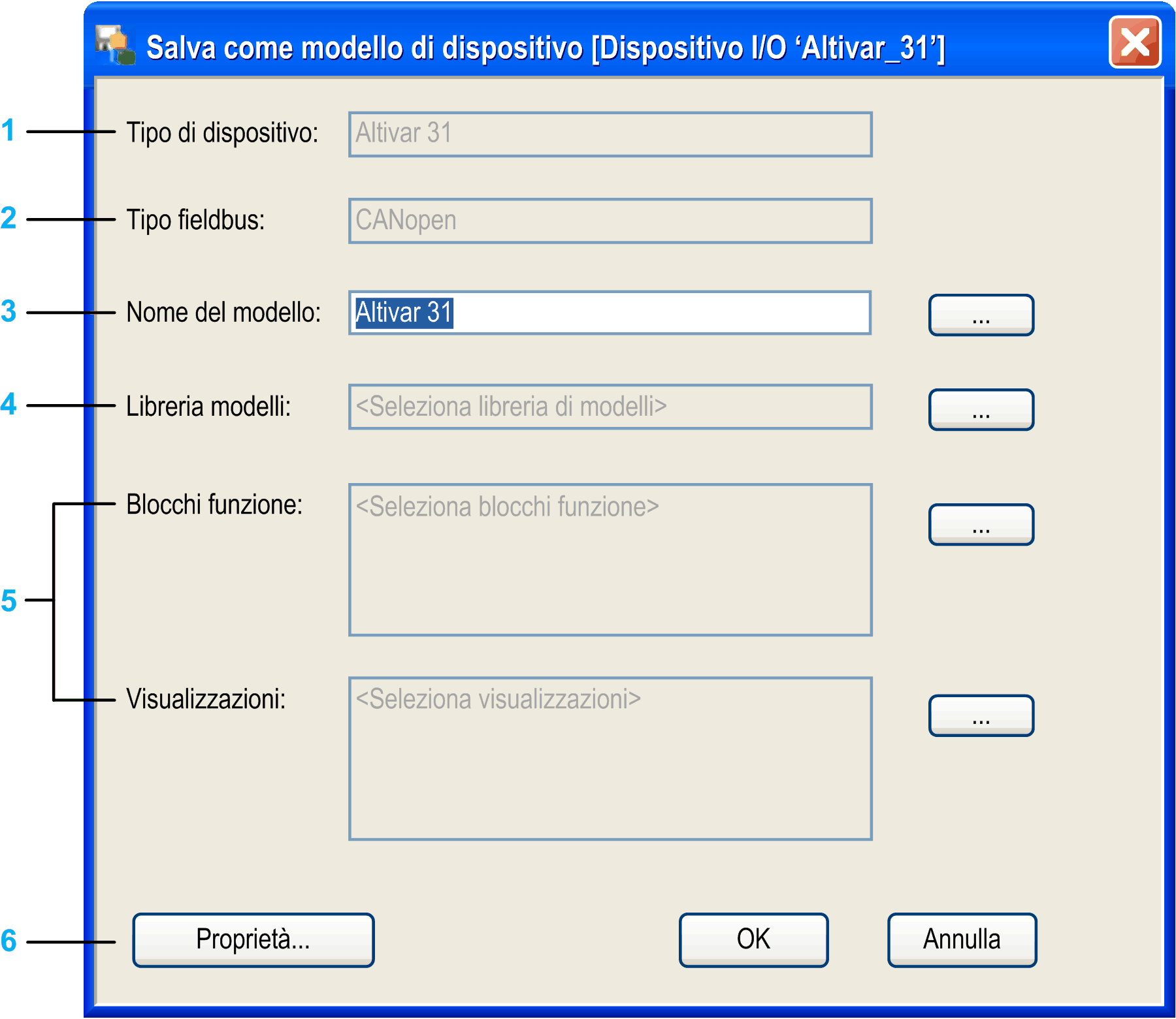 6 Pulsante Proprietà per aggiungere ulteriori informazioni al modello di dispositivo