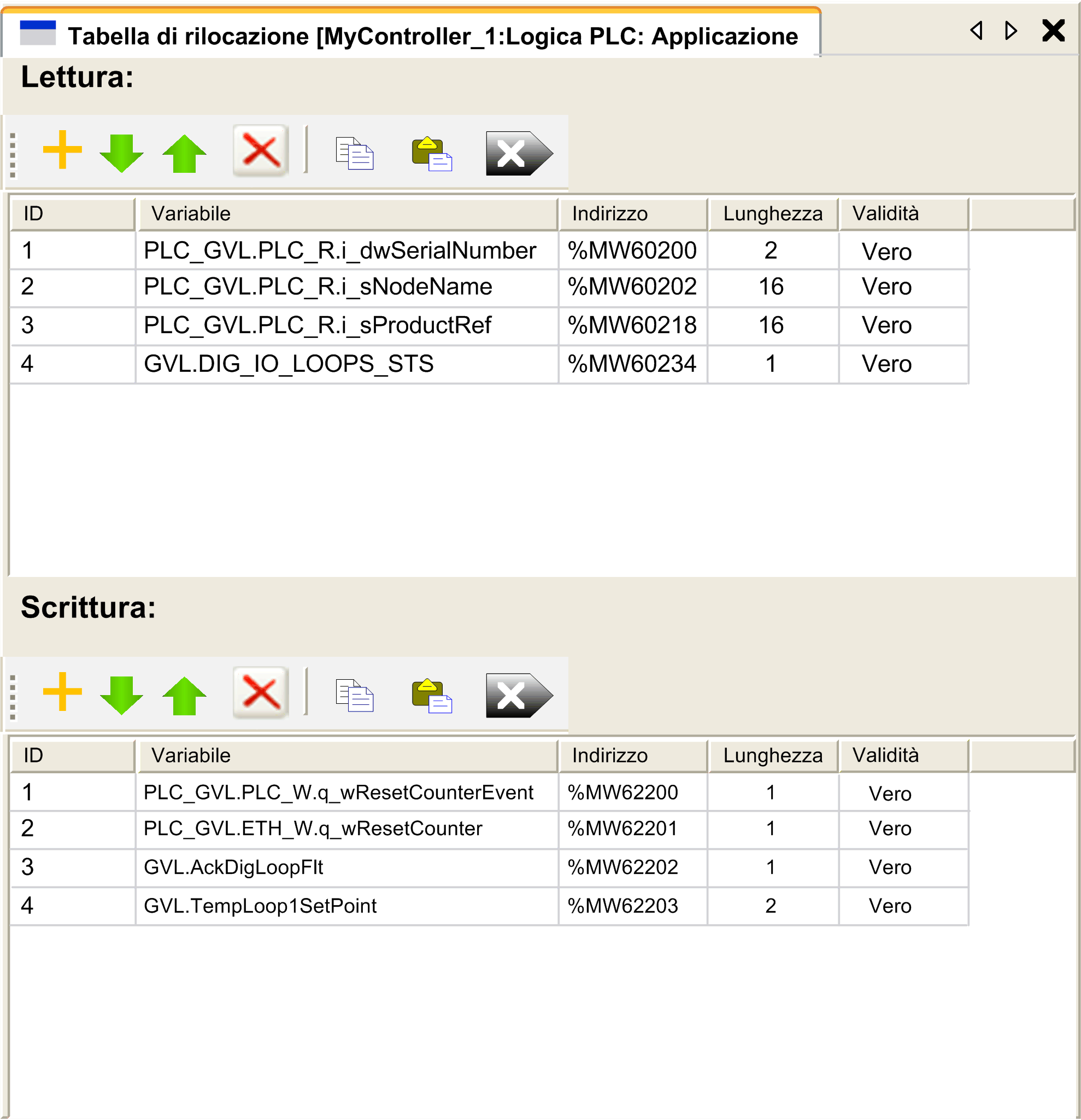 L'editor della tabella di rilocazione consente di organizzare le variabili nella tabella di rilocazione.