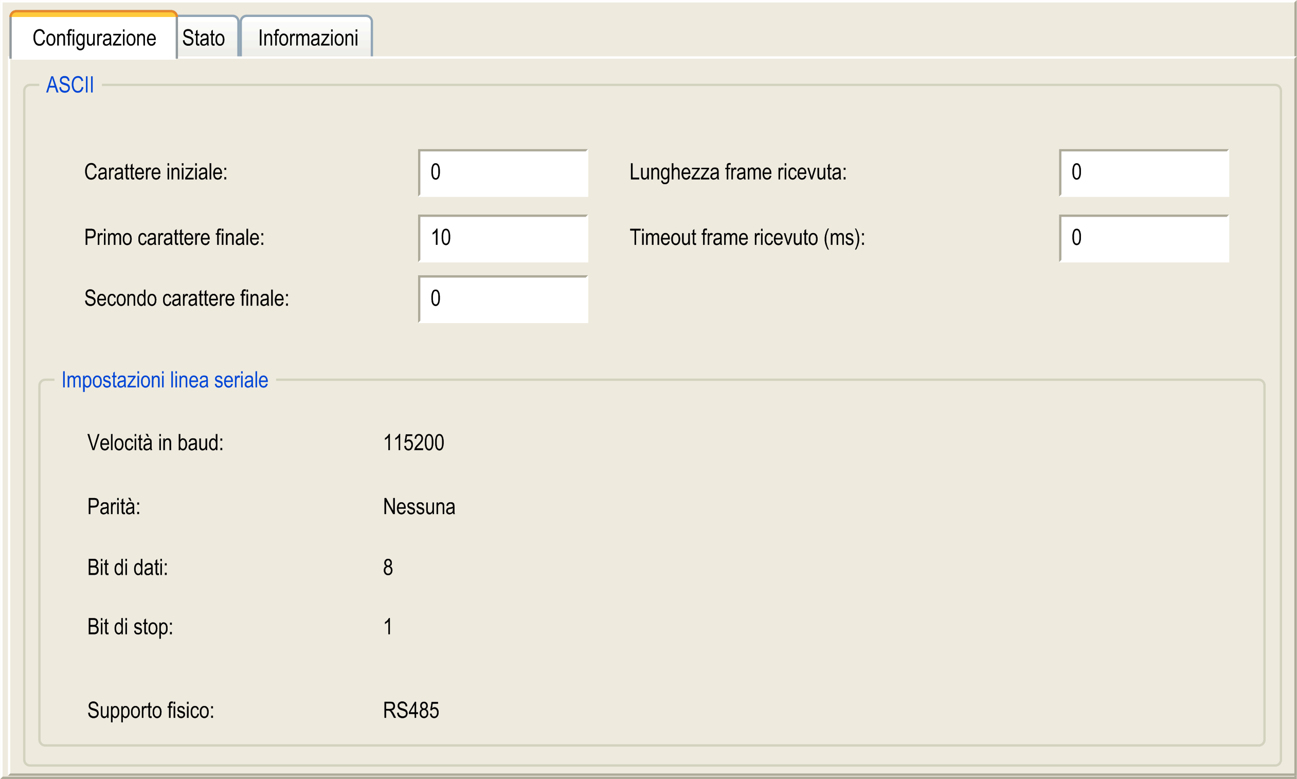 Parametri specificati nella finestra di configurazione Linea seriale. |