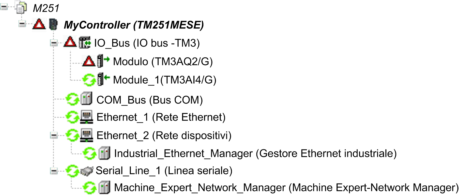 Quando EcoStruxure Machine Expert è in modalità online, accanto al modulo di espansione TM3 o ai moduli in errore compare un triangolo rosso e accanto al nodo nella finestra .