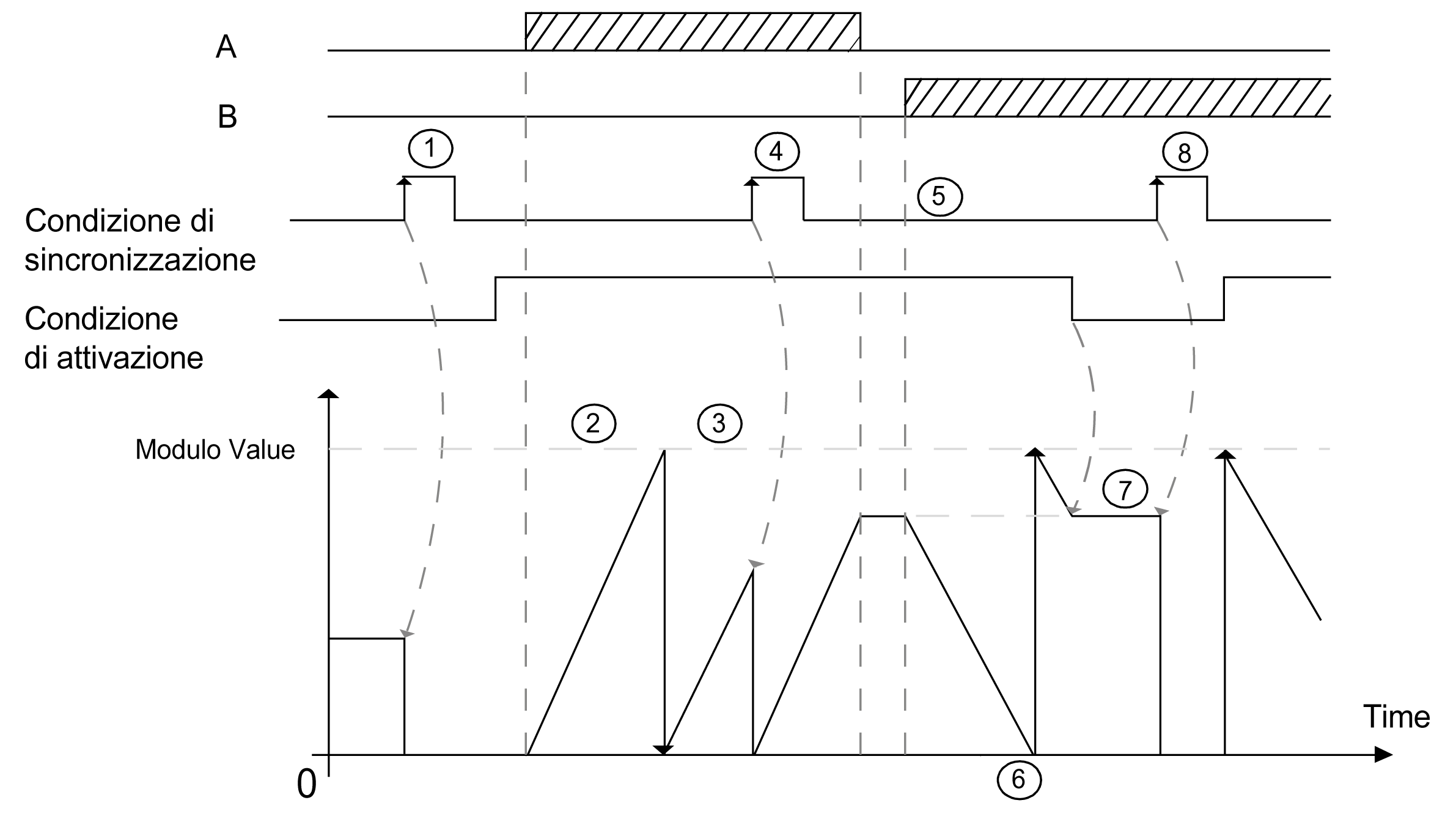 Sul fronte di salita della condizione di sincronizzazione, il valore del contatore è reimpostato a 0. |