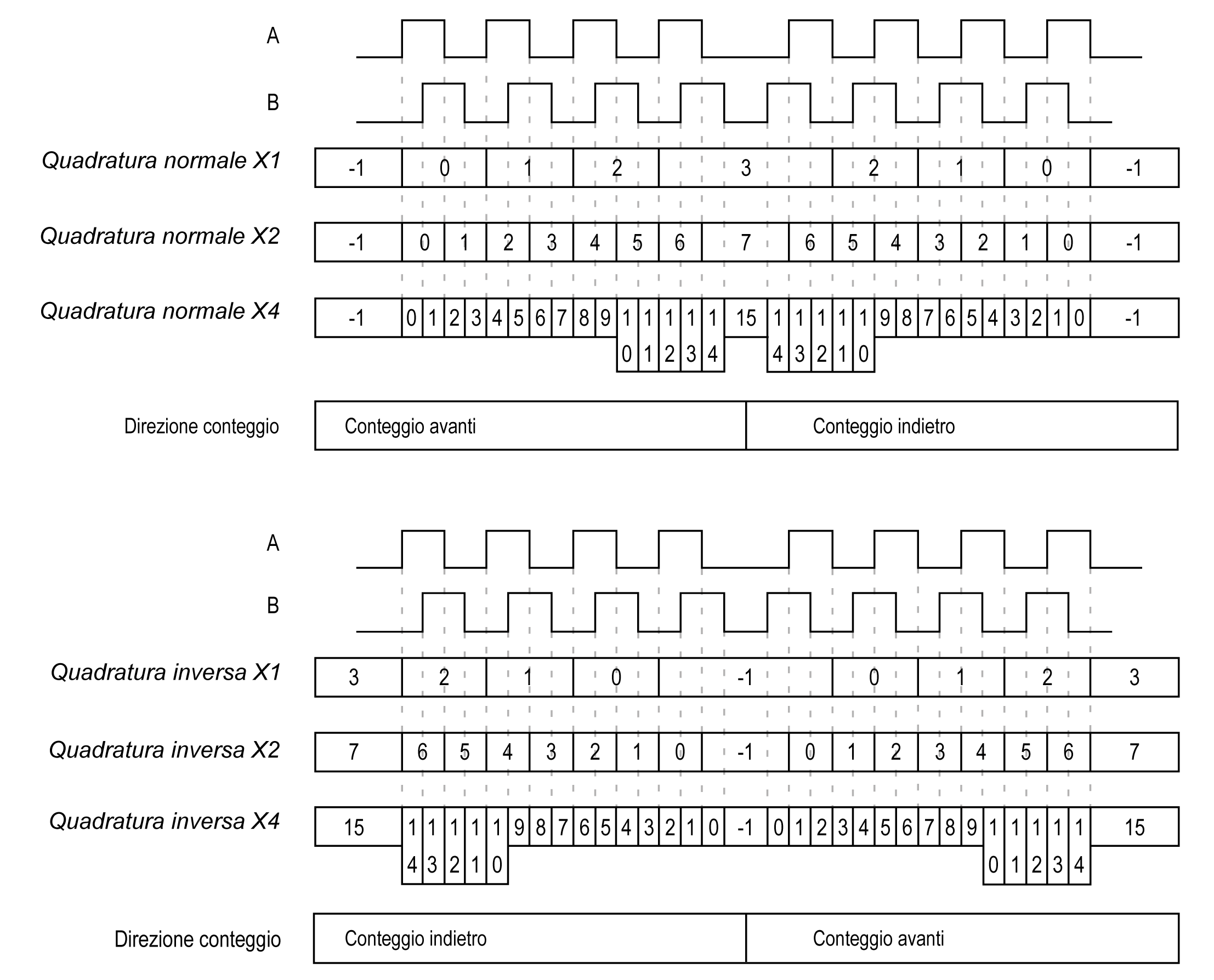Un encoder fisico fornisce sempre due segnali sfasati di 90° che consentono al contatore di contare gli impulsi e di rilevare la direzione: