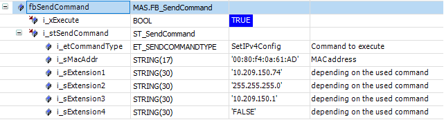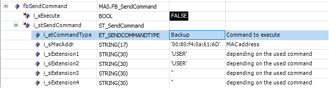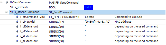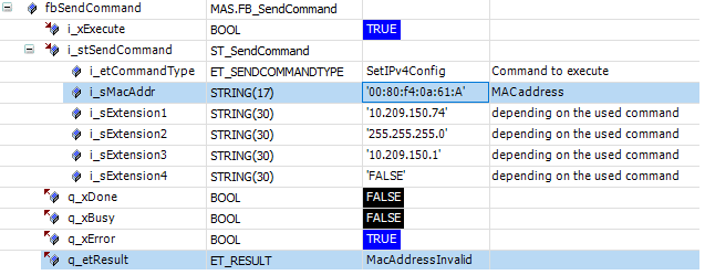 根据命令,结构 ST_SendCommand(FB_SendCommand 的输入)包含不同的必要部分。需要正确的 MAC 地址。