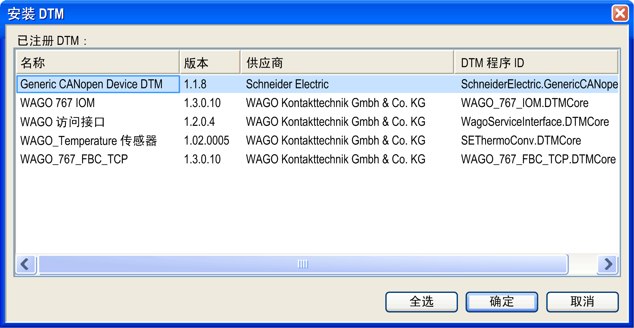 、 、 和 的信息。若要将 DTM 安装到设备存储库,请选择所需的 DTM,然后单击 按钮。