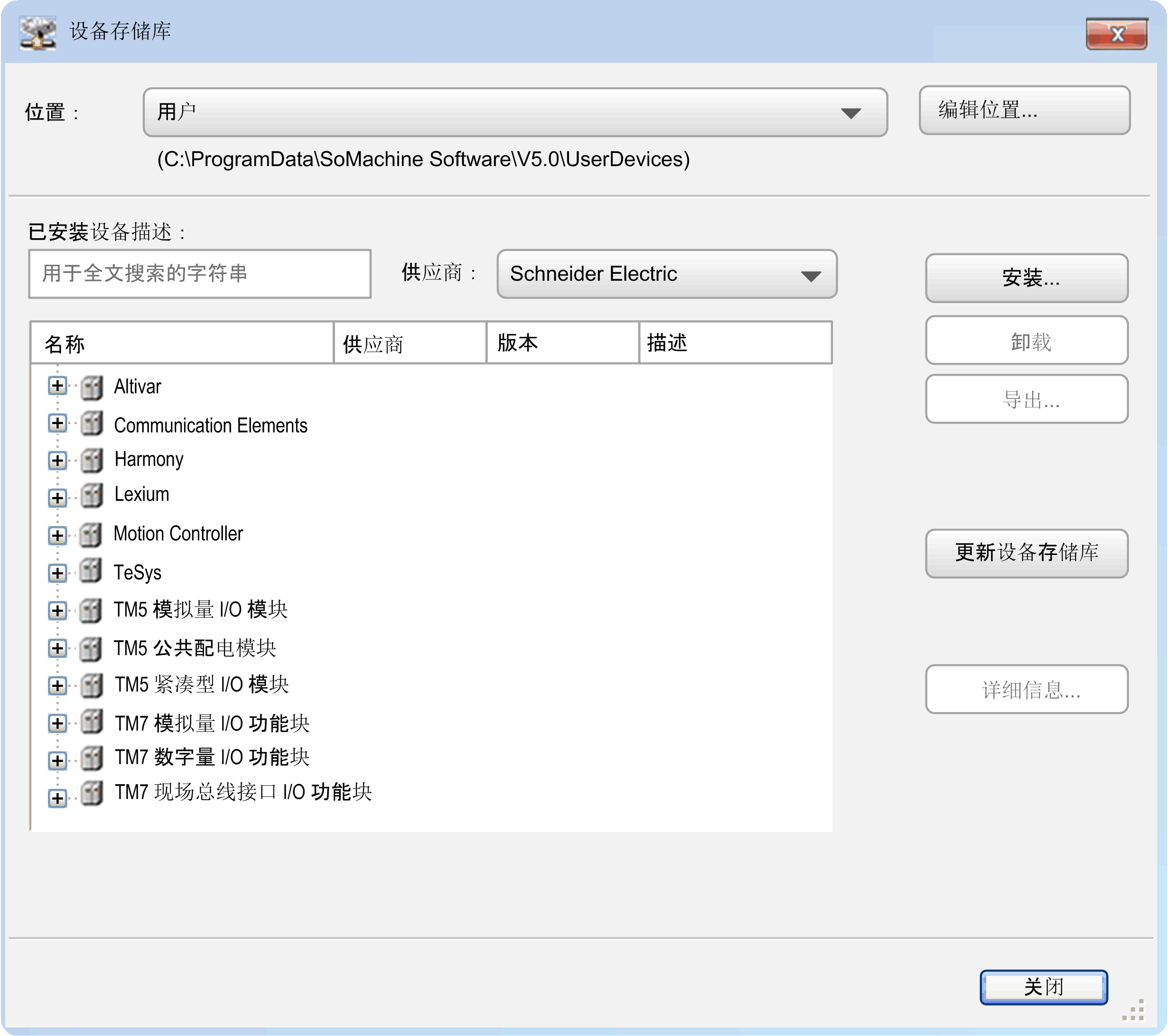 确认选择后,该对话框关闭,新设备将添加到 对话框的设备树中。安装过程中检测到的错误(即缺少由设备描述引用的文件)将显示在 对话框的下部。