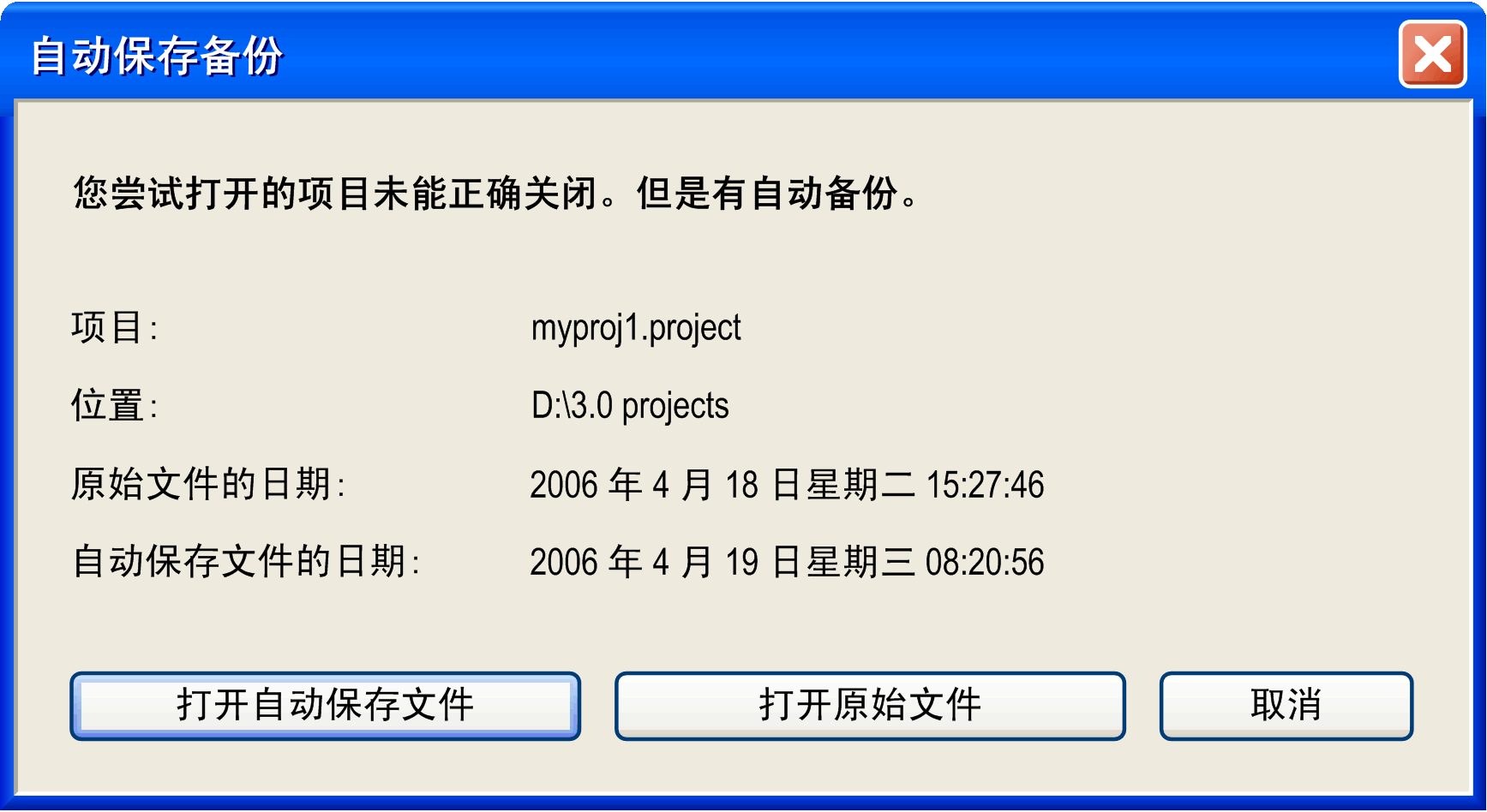 自动保存文件 <项目名称>.autosave 将会打开并标记为已修改。标题栏中文件名的后面显示一个星号 (*)。 |