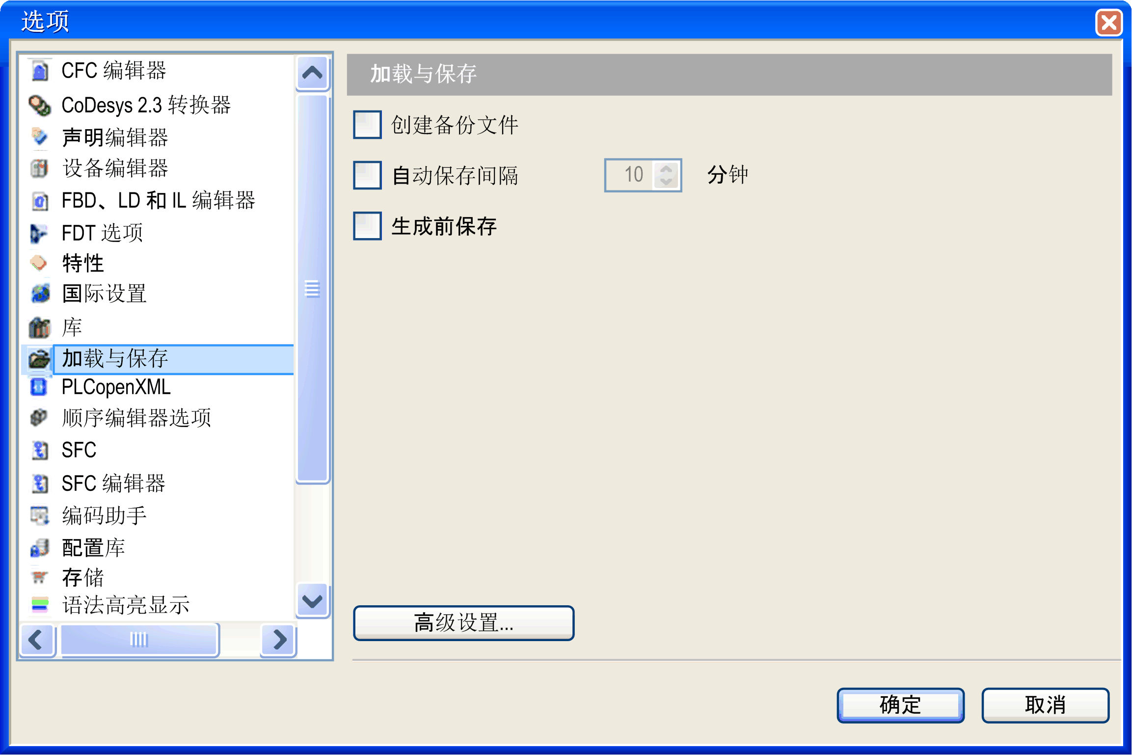 通过对话框,可进行与加载和保存项目时 EcoStruxure Machine Expert 的行为有关的设置。