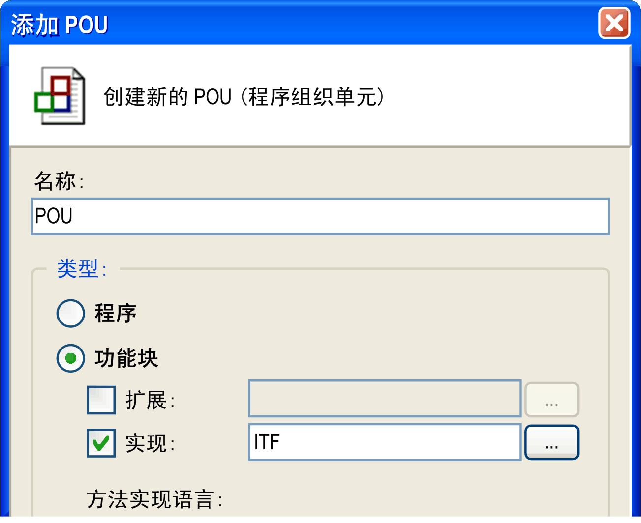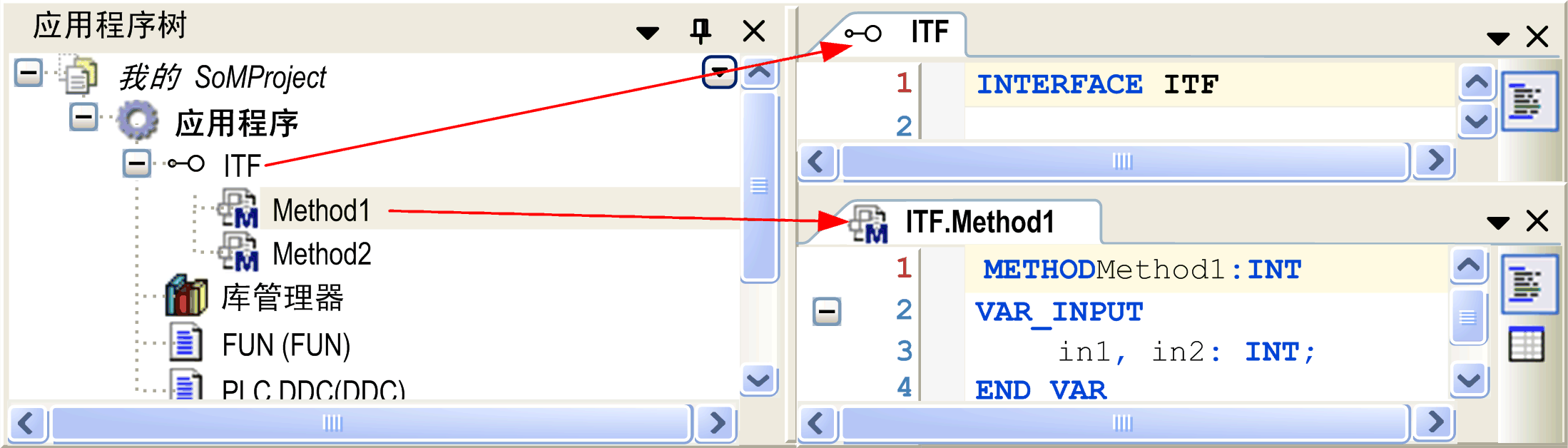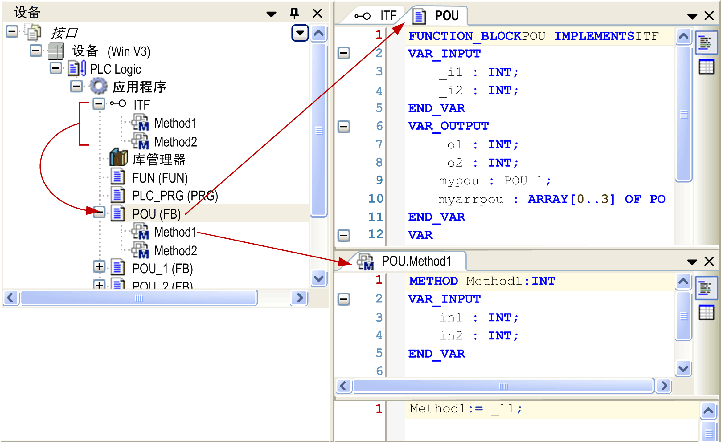当将功能块 POU 添加至时,将根据 Method1 的定义自动在下面插入方法 Method2 和 ITF。现在可用特定于功能块的实现代码来填写它们。