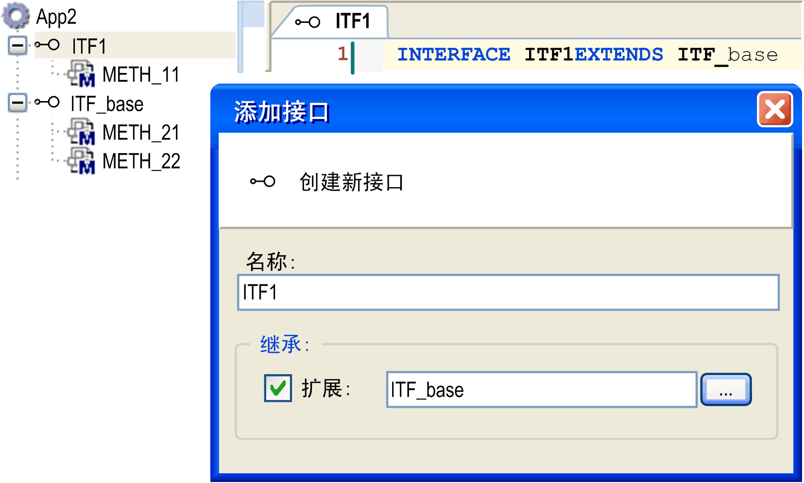 在对话框中,为新接口输入名称(<接口名称>)。如果您希望当前接口成为另一个接口的扩展,您也可选择激活选项。