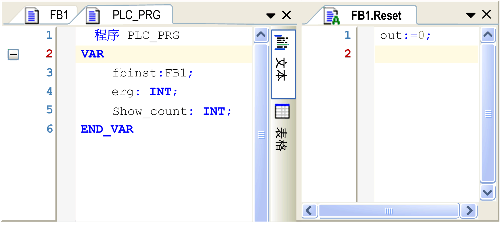 在该示例中,功能块 FB1 的每次调用增大或减小输出变量 out,具体取决于输入变量 in 的值。功能块的调用动作 Reset,将输出变量 out 设置为 0。在这两种情况下将写入同一变量 out。