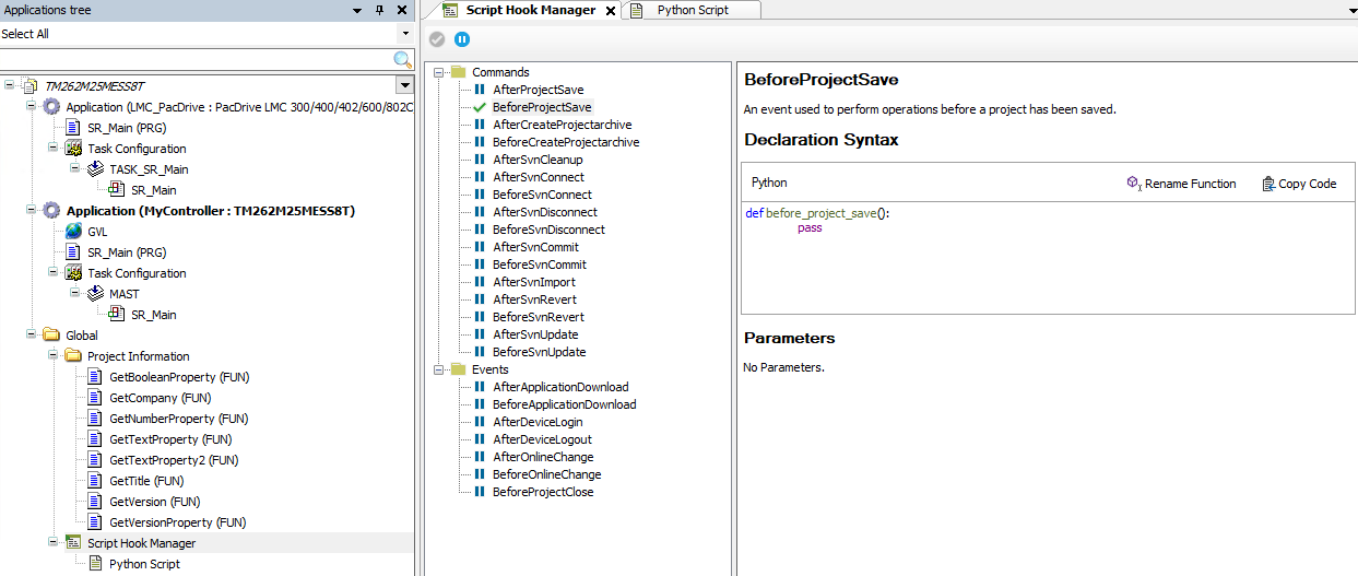 为在运行 EcoStruxure Machine Expert 时可以执行的多个命令和事件提供接口。命令执行或事件删除可能触发对特定 Python 脚本的执行。您可以对自己的 Python 脚本编程,也可以使用 EcoStruxure Machine Expert 随附的其中一个 Python 模板。