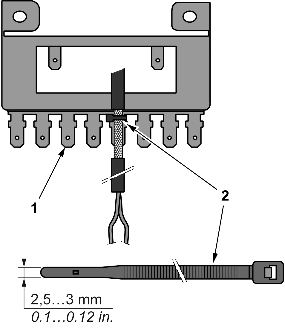 使用尼龙紧固件 (2)(宽度为 2.5 至 3 毫米(0.1 至 0.12 英寸))和相应工具夹紧固定刀片连接器 (1)。 |
