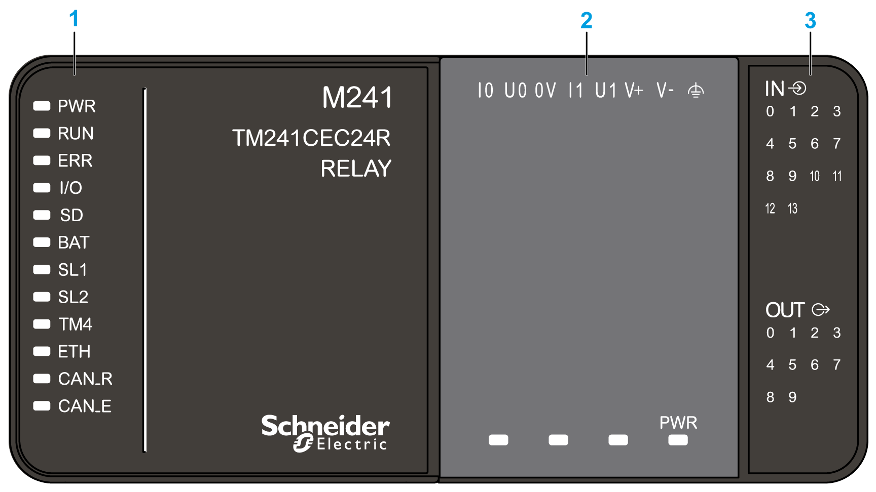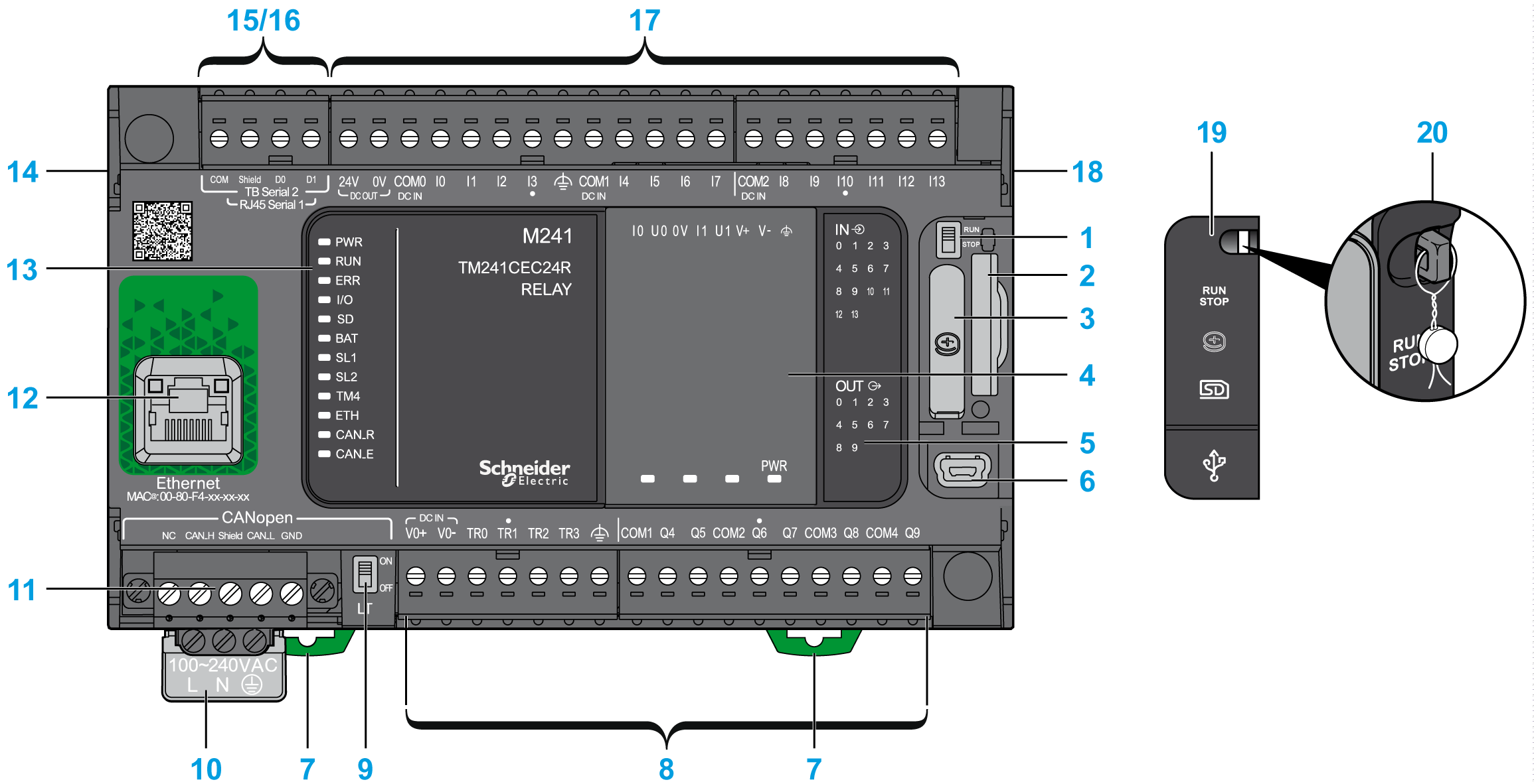 下图显示了 TM241CEC24R 逻辑控制器的各个组件:
