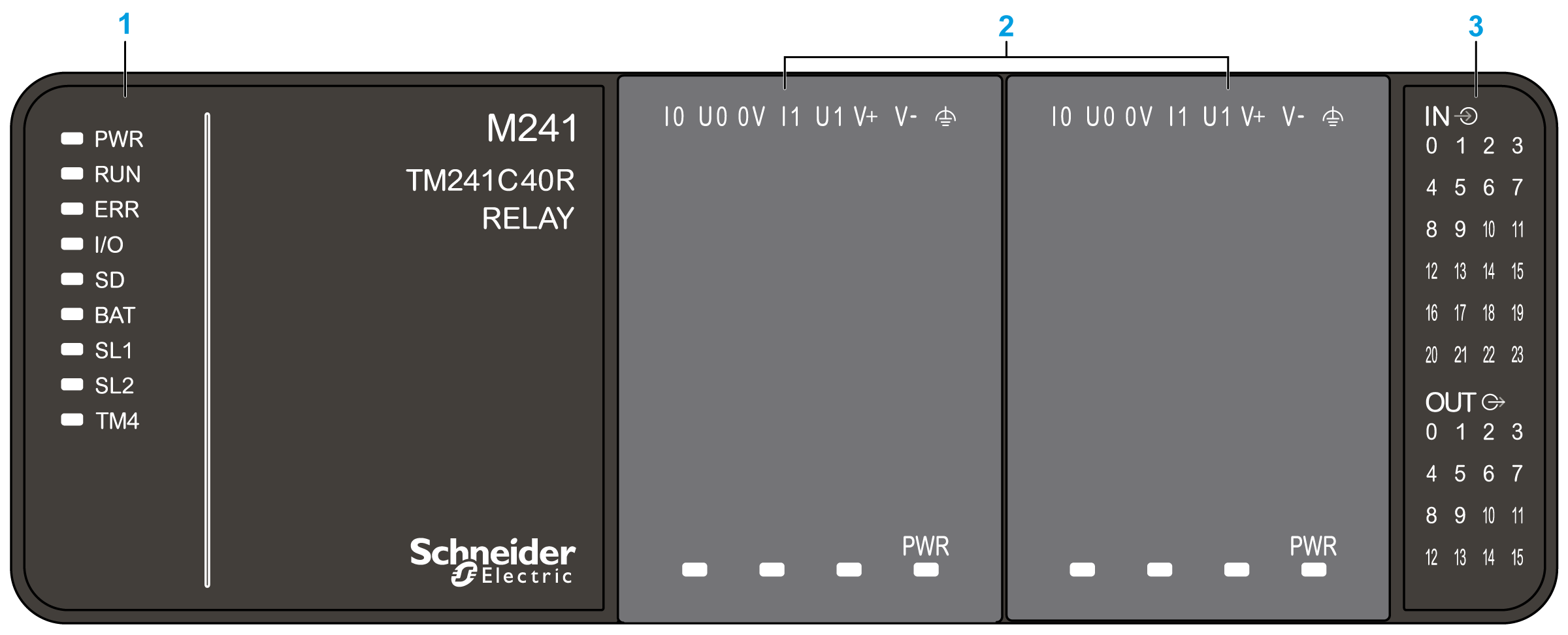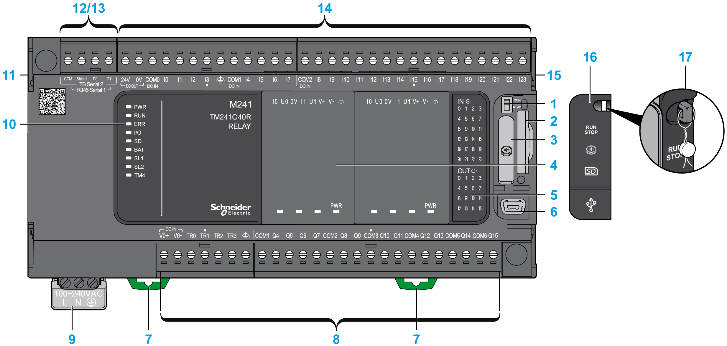 下图显示了 TM241C40R 逻辑控制器的各个组件: