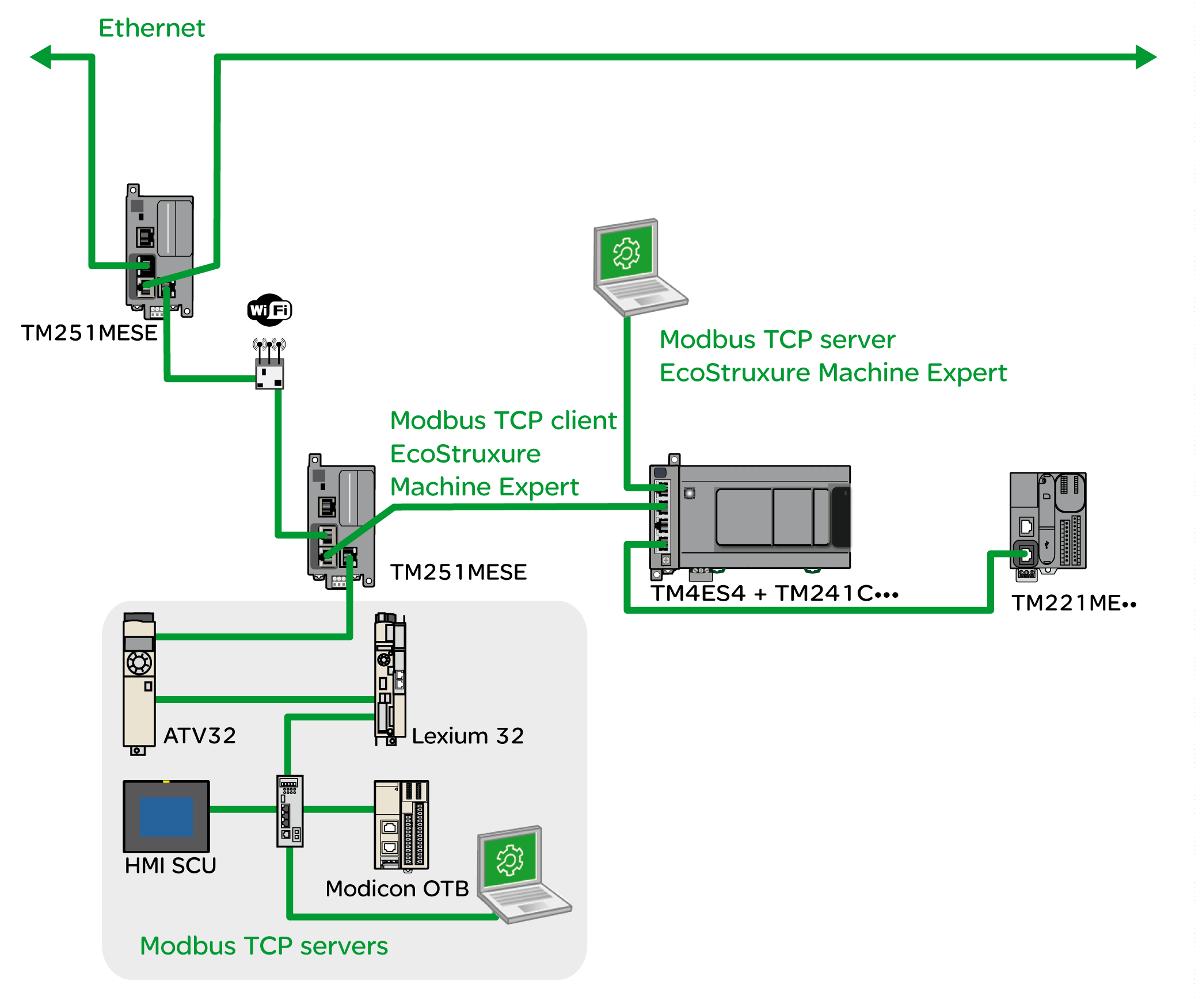 TM251MESE 有两个不同的以太网网络。每个都有自己唯一的 IP 和 MAC 地址。