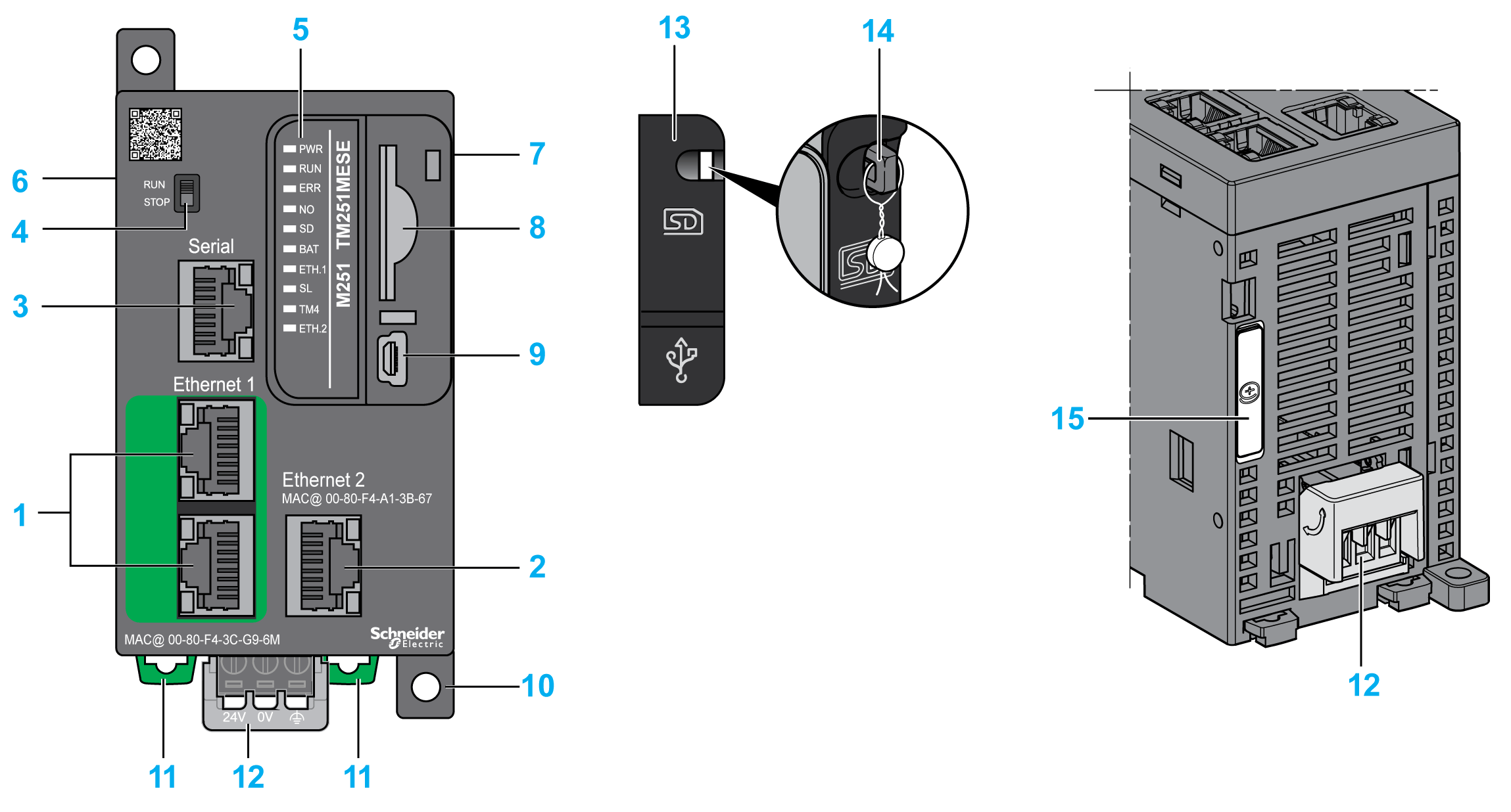 下图显示了 TM251MESE Logic Controller 的各个组件:
