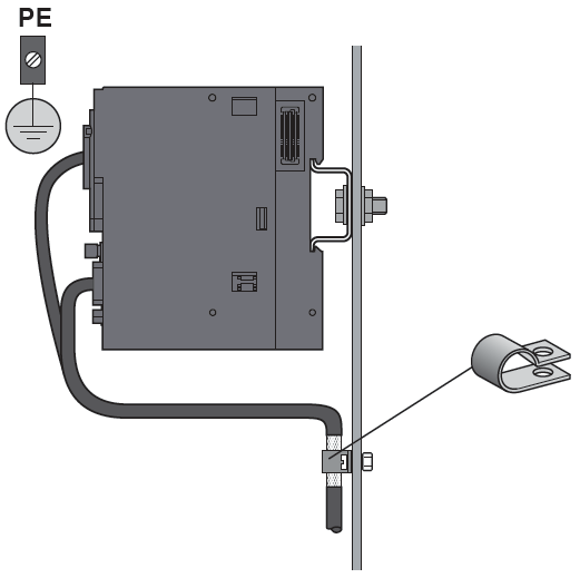 必须将屏蔽电缆牢固接地。必须使用固定在安装的导电背板上的连接线夹将现场总线通讯电缆屏蔽层连接到保护性接地 (PE)。