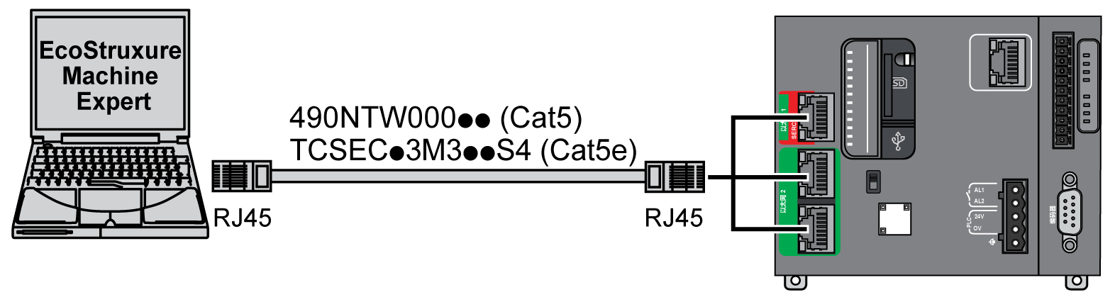 USB Mini-B 端口是编程端口,可以通过EcoStruxure Machine Expert软件连接到带 USB 主机端口的 PC。使用典型的 USB 电缆时,此连接适合用于程序的快速更新或持续时间较短的连接,以执行维护和检查数据值。如果不使用帮助把电磁干扰的影响降到最低的专门电缆,则此连接不适合长时间连接(如调试或监控)。