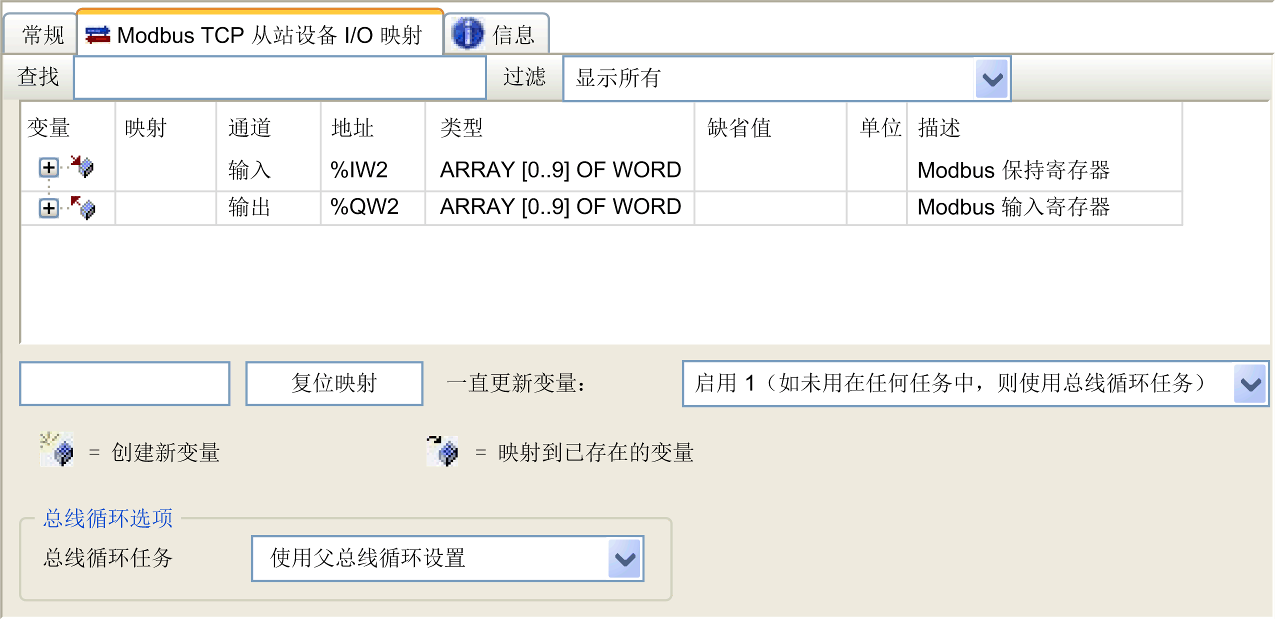 在配置 后,发送到其单元 ID(Modbus 地址)的 Modbus 命令便会访问控制器的 %IW 和 %QW 对象,而不是当单元 ID 为 255 时被访问的常规 Modbus 字。这有利于 Modbus TCP IOScanner 应用程序进行读/写操作。