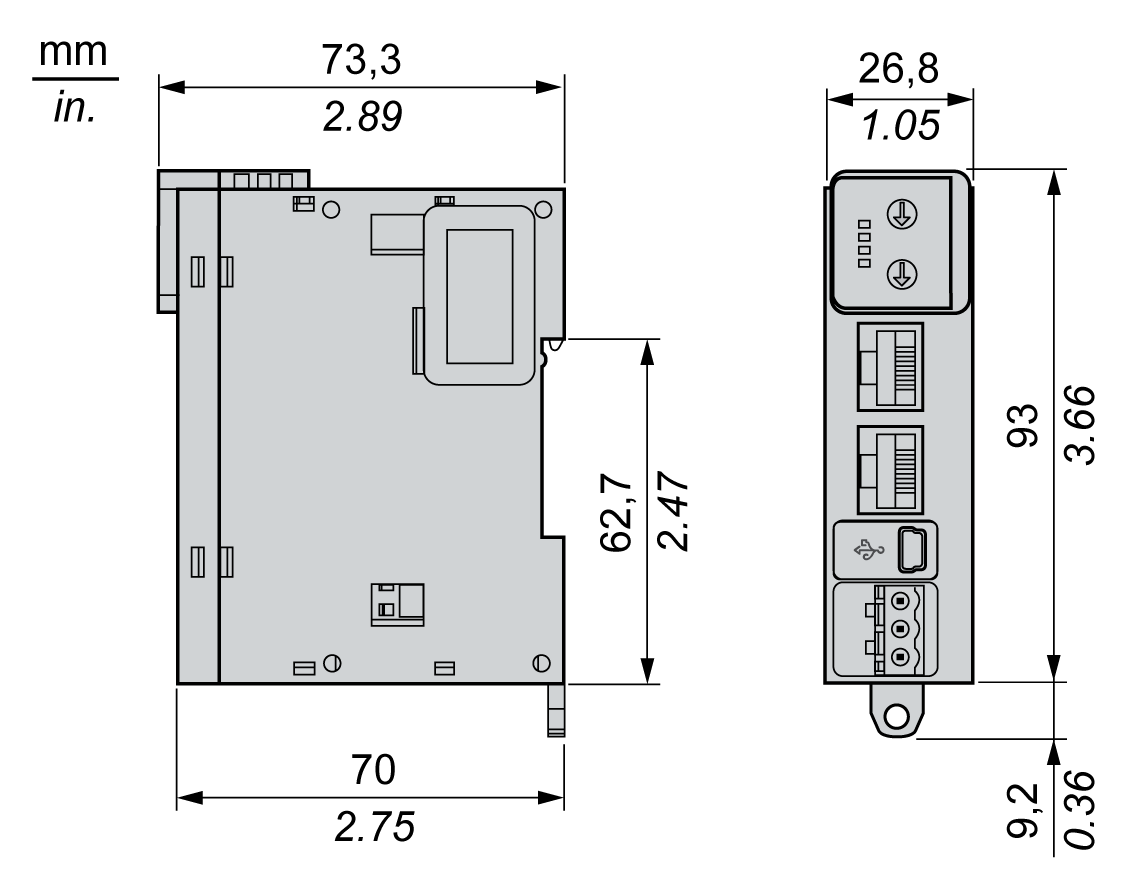 下图显示了 Modicon TM3 总线耦合器 的外部尺寸: