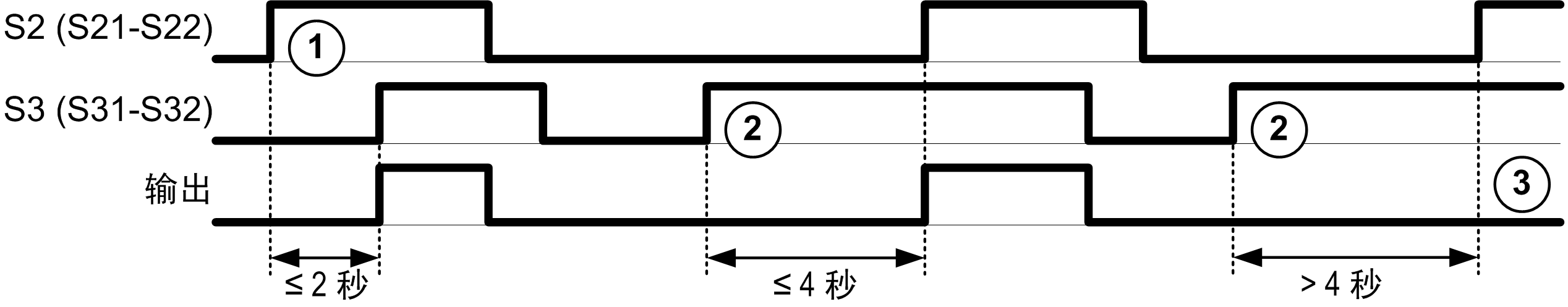 在启用同步时间监控后,如果输入 S21-S22 和输入 S31-S32 在 2 至 4 秒内激活,则允许激活输出。定义时间取决于先激活的输入,如下图所述。如果同步时间已过期,则不能激活输出。