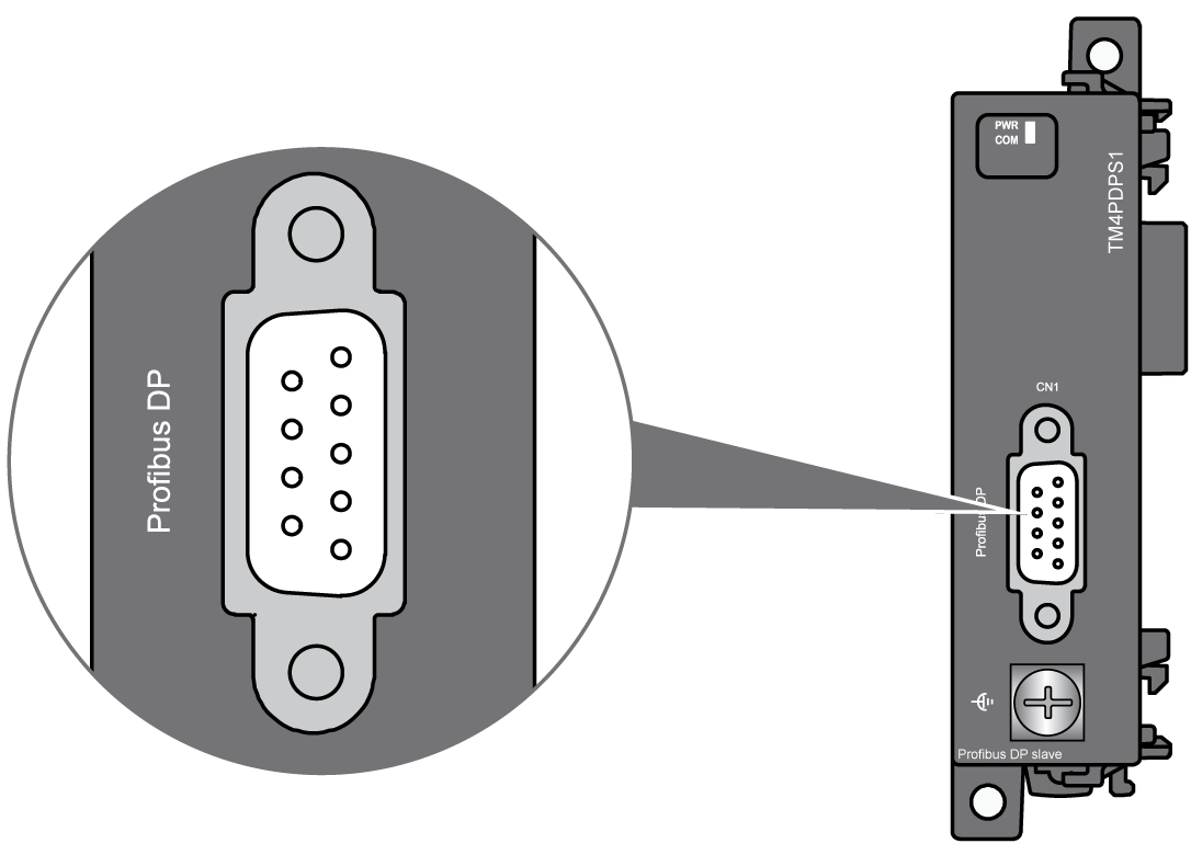 TM4PDPS1 模块配备了 1 个 PROFIBUS DP SUB-D 9 连接器: