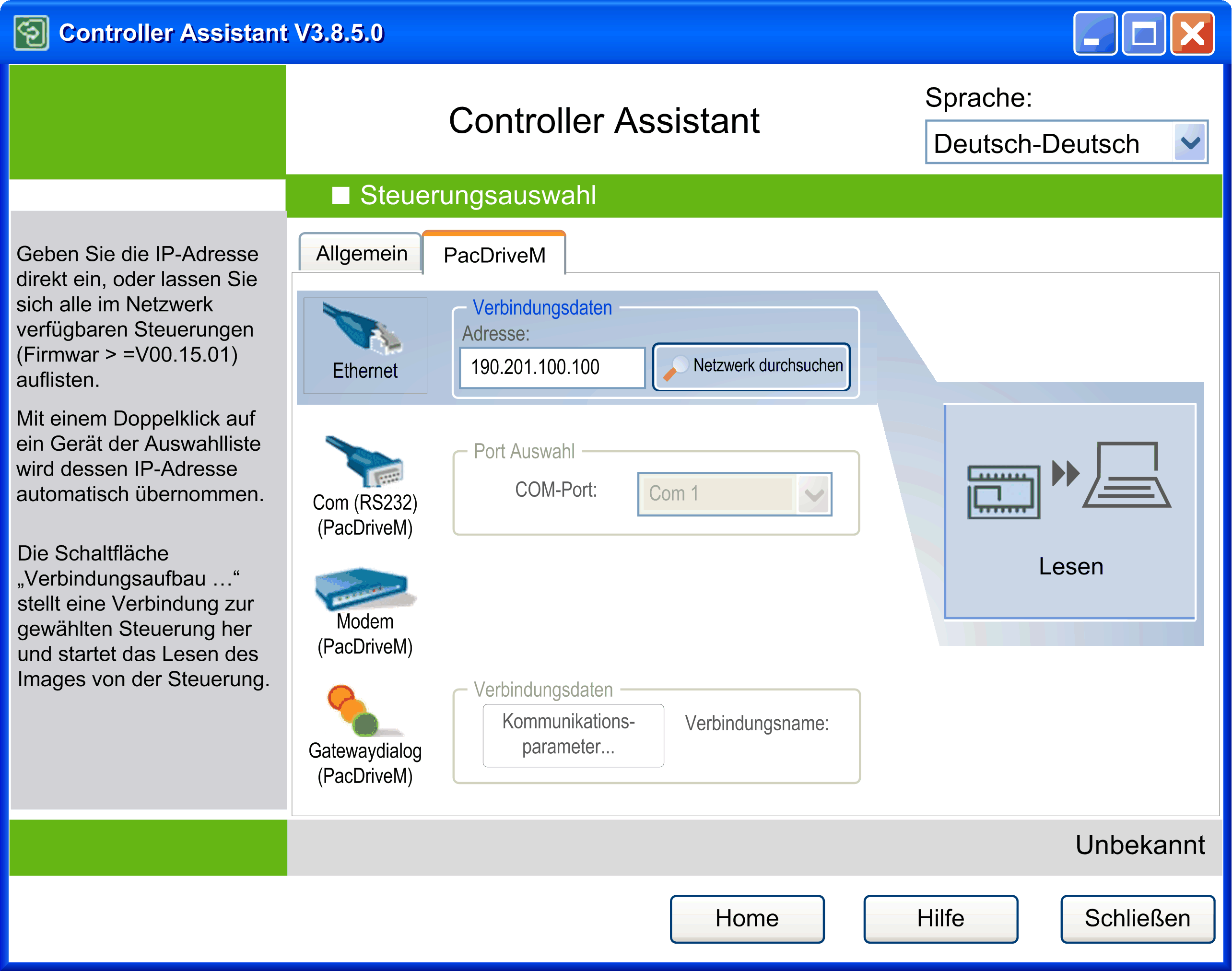 enthält die verschiedenen Optionen zur Auswahl vonWählen Sie in der Liste am linken Rand eine Datenübertragungsmethode aus (PacDrive M-Steuerung zu identifizieren (z. B. die IP-Adresse).