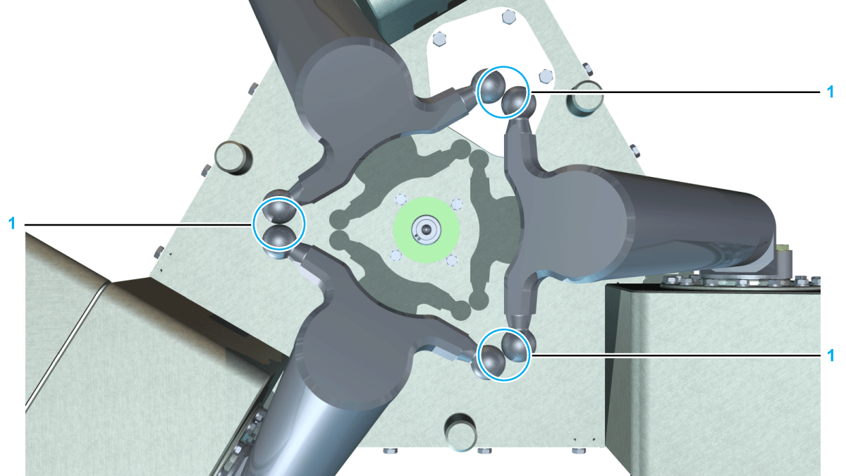 Calibrate each of the three main axis motors by using the function HomeOnTorque for moving the ball pin of the upper arm to the calibration bolts (1).