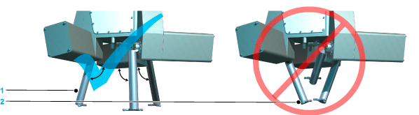 Do not move the upper arms beyond their vertical downward position (1) in order to prevent the individual robot arms from colliding with one another during their calibration travel (2). ![]() |