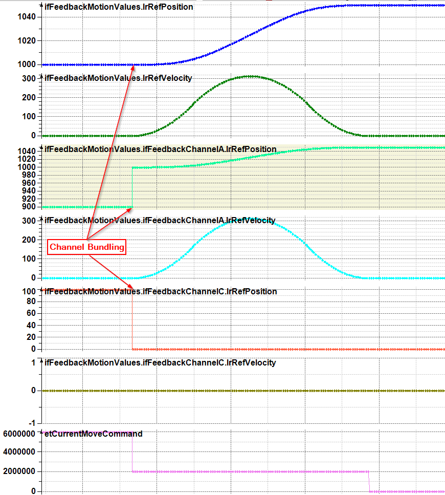 Bei der Kanalbündelung werden die Bewegungswerte von Kanal C an Kanal A übertragen. Die Sollposition des Carriers auf Kanal A beträgt nun 1000 mm.