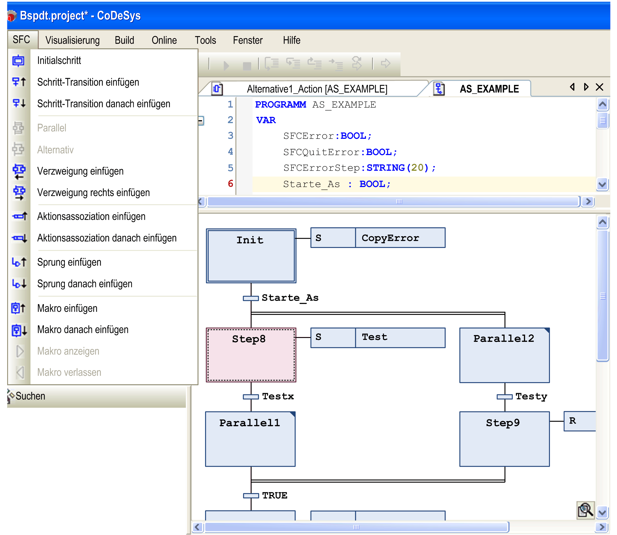 Die in einem AS-Diagramm verwendeten Elemente stehen im Menü zur Verfügung. Das Menü ist verfügbar, wenn der AS-Editor aktiv ist. Ordnen Sie sie in einer Abfolge oder in parallelen Abfolgen von Schritten an, die durch Transitionen (Weiterschaltbedingungen) miteinander verbunden sind. Weitere Informationen finden Sie unter Arbeiten im AS-Editor.