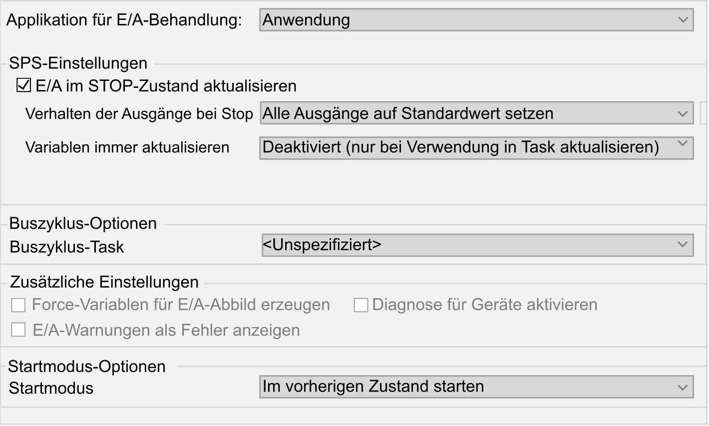 Diese Konfigurationseinstellung ist die übergeordnete Einstellung für alle Parameter derBuszyklus-Task, die in der Gerätebaumstruktur der Anwendung verwendet werden. Einige Geräte mit zyklischen Aufrufen, wie z. B. der CANopen-Manager, können einer bestimmten Task zugeordnet werden. Wenn für die Einstellung des Geräts die Einstellung Zykluseinstellungen des übergeordneten Busses verwenden eingegeben wurde, wird die Einstellung für die Steuerung verwendet. Diese Auswahlliste enthält alle Tasks, die derzeit in der aktiven Anwendung definiert sind. Die Standardeinstellung ist „MAST-Task“.