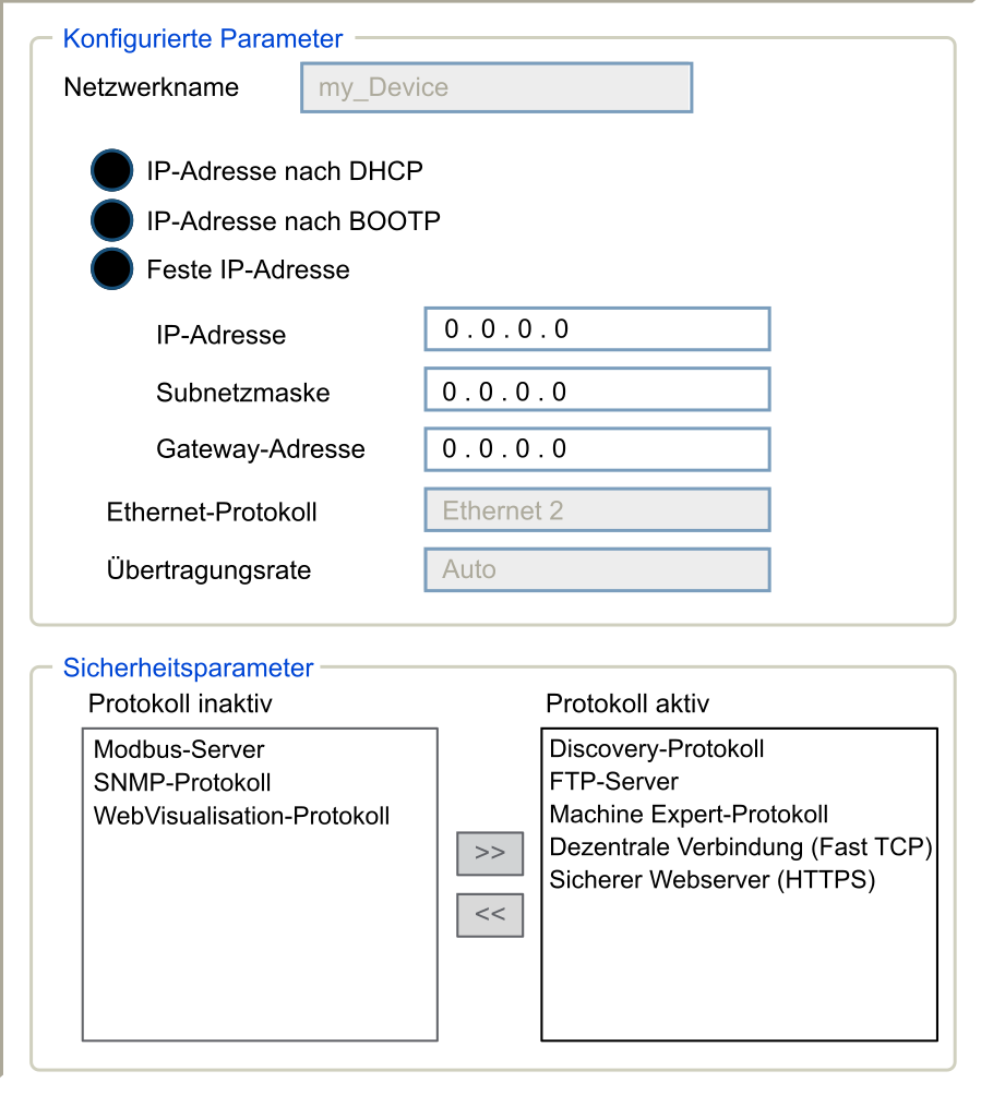 Dieser Parameter deaktiviert das Machine Expert-Protokoll an den Ethernet-Schnittstellen. Wenn dieser Parameter deaktiviert ist, wird jeder Machine Expert-Request von jedem Gerät zurückgewiesen. Aus diesem Grund ist keine Verbindung über Ethernet von einem PC mit EcoStruxure Machine Expert, von einem HMI-Ziel, das Variablen mit dieser Steuerung austauschen möchte, von einem OPC-Server oder von Controller Assistant möglich. |