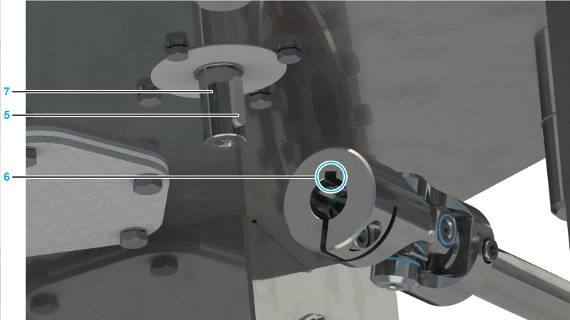 Push the universal joint (6) over the shaft (7) protruding from the robot housing until the universal joint comes into its stop position on the gear shaft flange. In doing so, rotate the universal joint to ensure that the recess in the universal joint is located above the keyway (5).