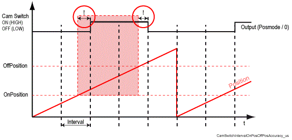 The activation window (OnPosition and OffPosition including compensation periods OnDelay and OffDelay) must have a width of at least one interval, as otherwise cams will not be detected and the output (actor) is not actuated.