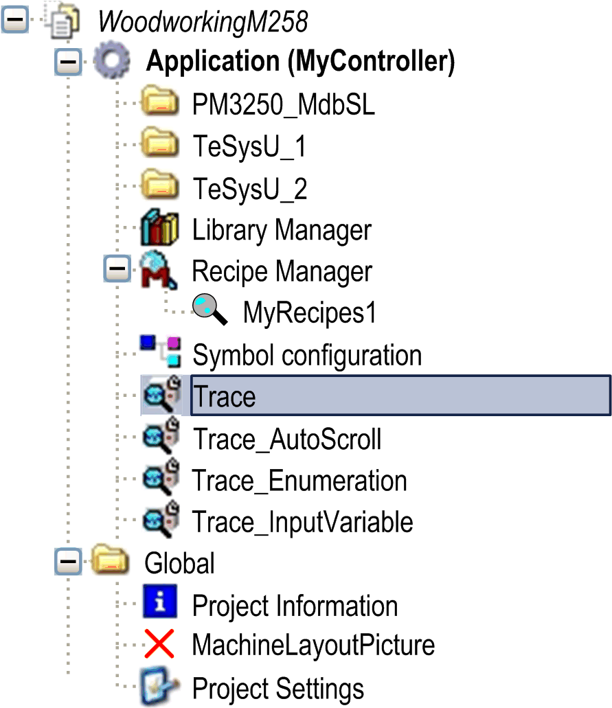 The trace functionality allows you to capture the progression of the values of variables on the controller over a certain time, similar to a digital sampling oscilloscope. Additionally, you can set a trigger to control the data capturing with input (trigger) signals. The values of trace variables are steadily written to an EcoStruxure Machine Expert buffer of a specified size. They can be observed in the form of a two-dimensional graph plotted as a function of time.