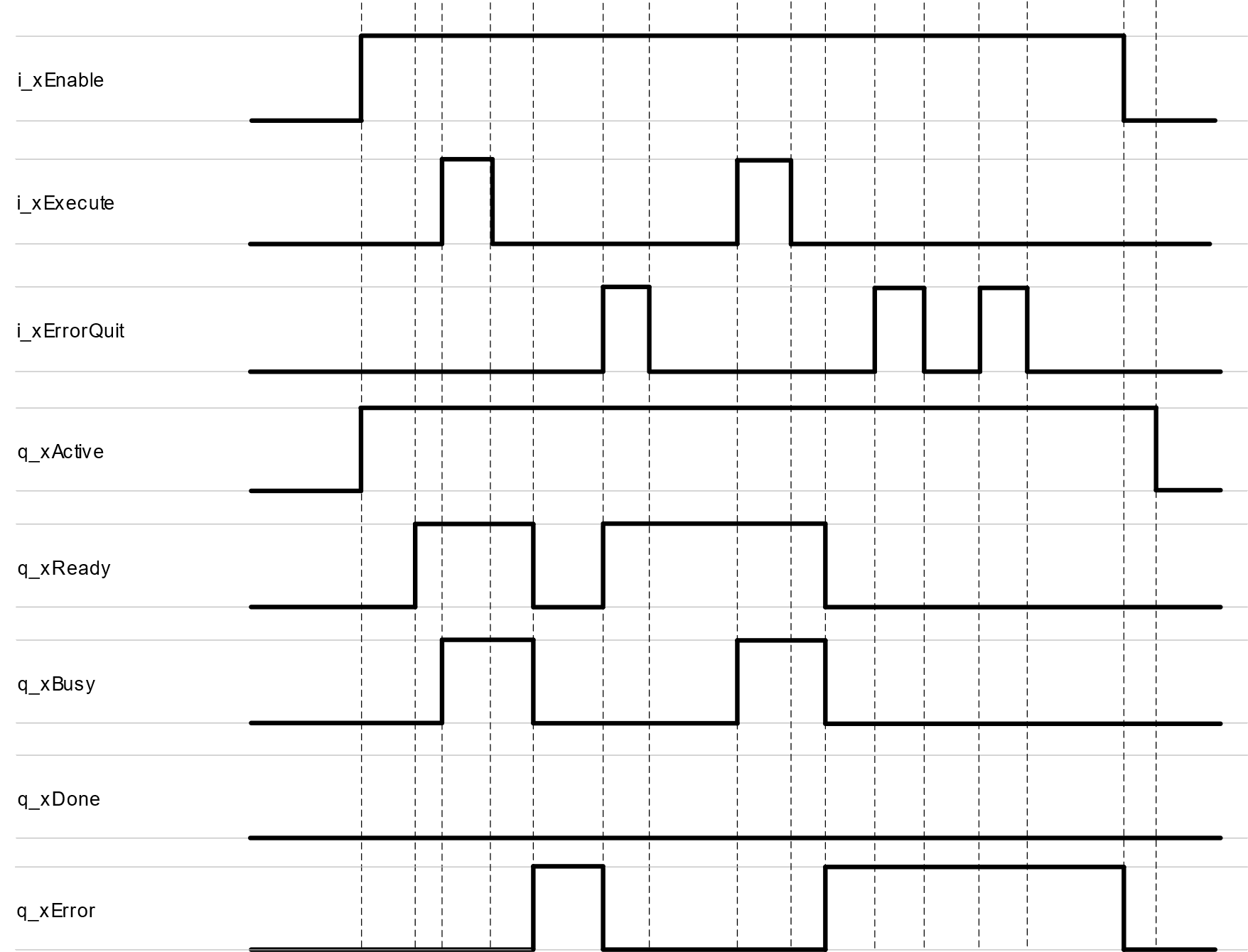 In case an error is detected, the output q_xReady is set to FALSE and a renewed execution of the function block is not possible as long as the error state is present. A rising edge of the input i_xErrorQuit acknowledges the error.