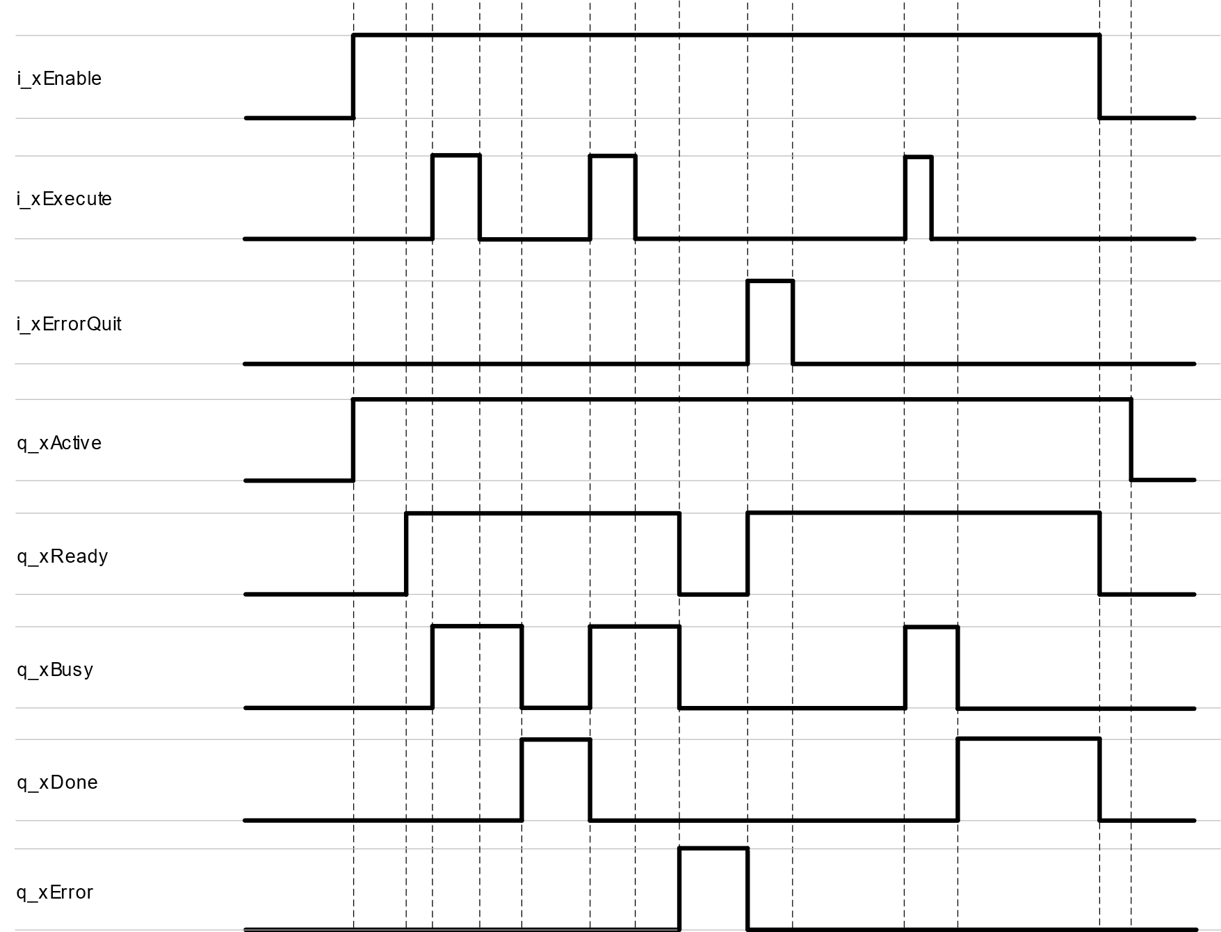 A rising edge of the input i_xExecute starts the execution of the function block. The function block continues execution and the output q_xBusy is set to TRUE. A rising edge at the input i_xExecute is ignored while the output q_xReady is FALSE or the function block is being executed.