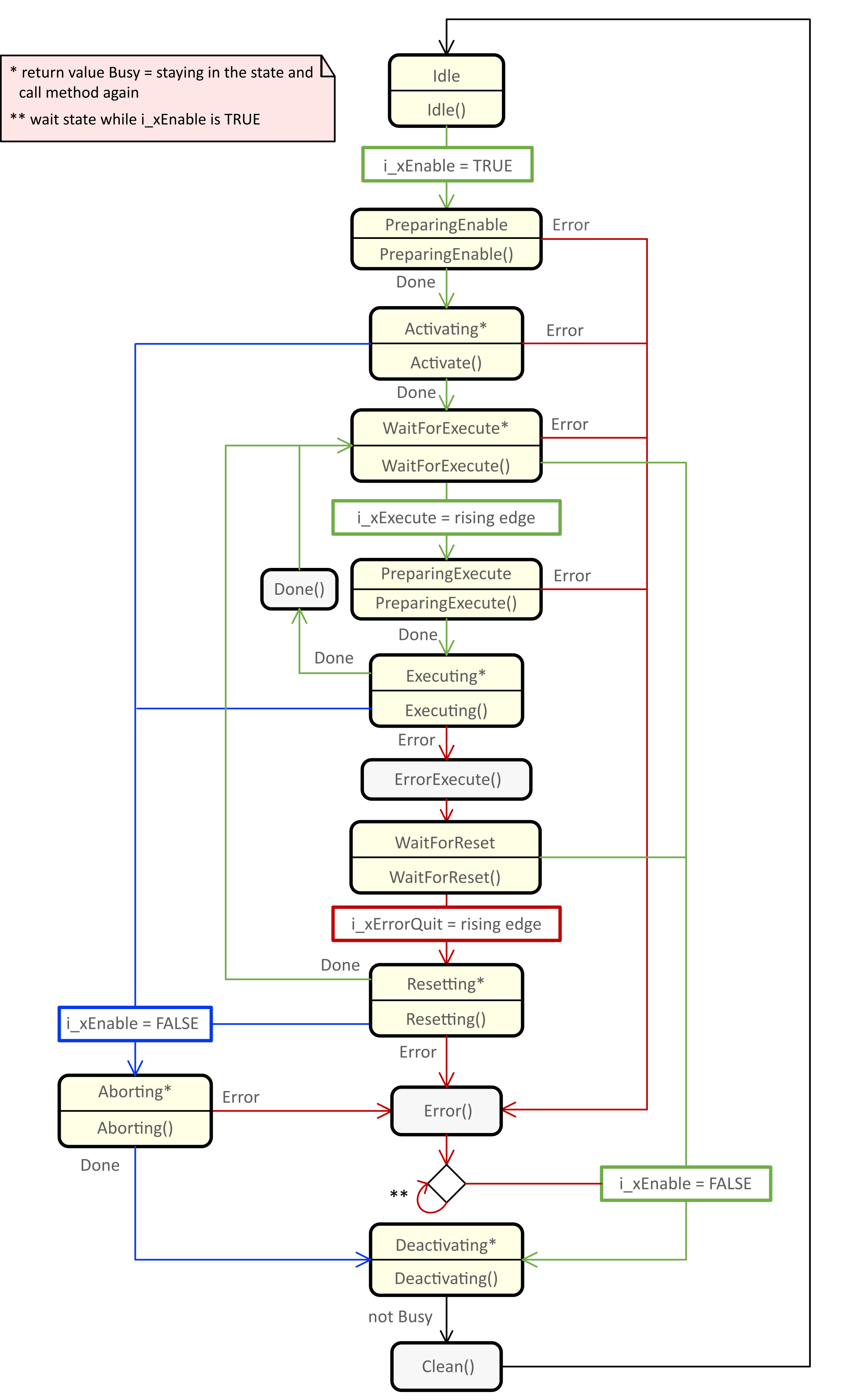 The state machine diagram illustrates the procedures, methods, states and state transitions that are defined for this function block.